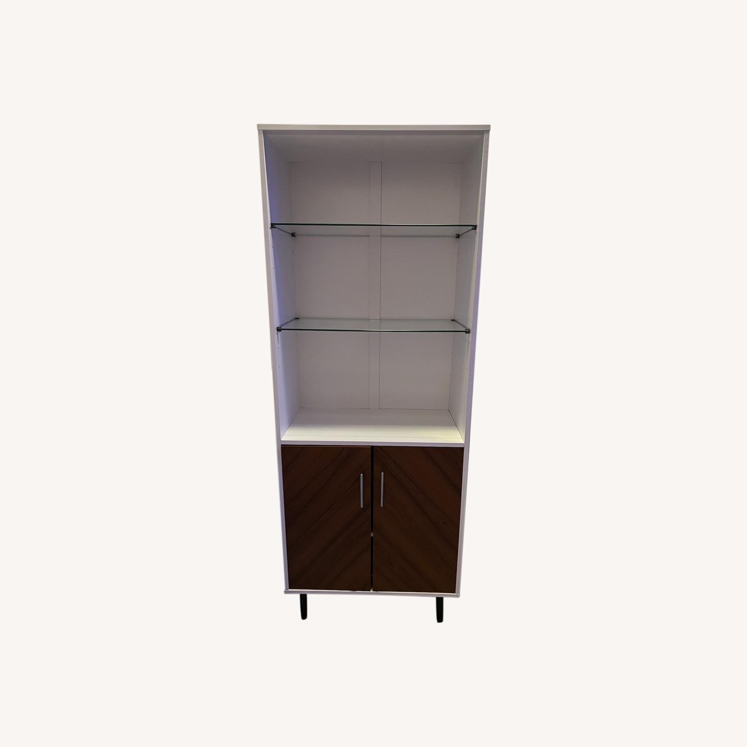Seller's Notes:Bookcase (1-year-old) with glass shelves and wooden doors at the bottom. Height = 68 inches Depth = 14 inches Width (side to side) = 26"