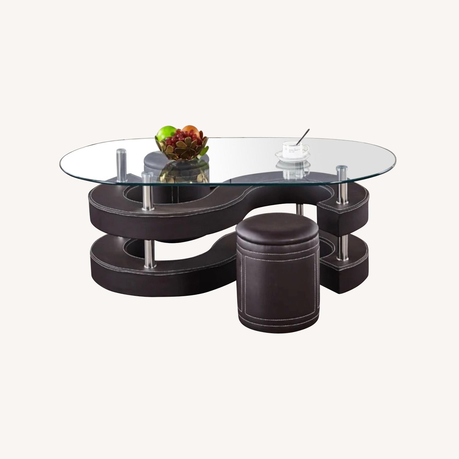 Seller's Notes:Glass top coffee table with leather base and 2 stools. Excellent condition