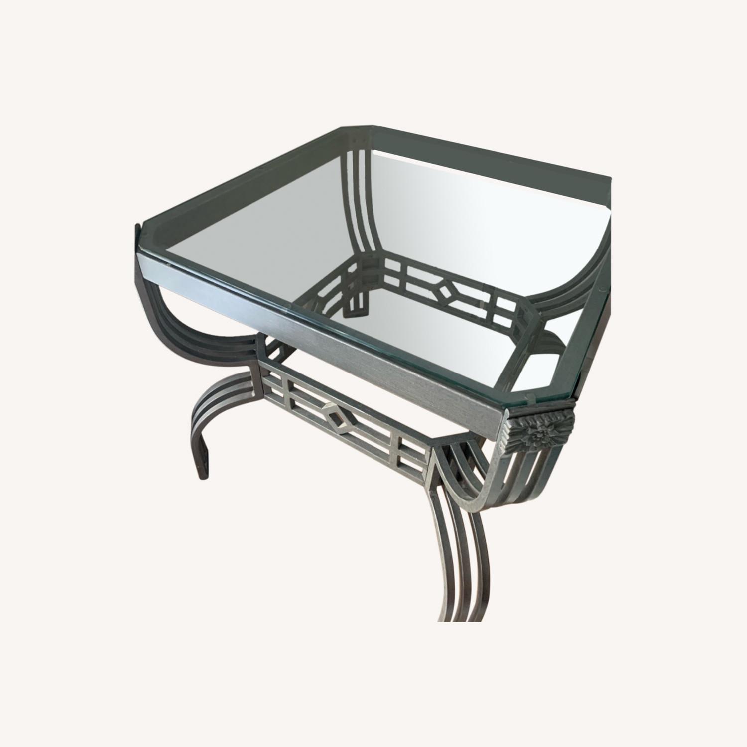 Seller's Notes:Glass Coffee Table Set, Square (2pc) 3 years old. Very heavy material. Gray welded metal frame. Tempered glass top. Includes 1 coffee table and 1 end table Coffee Table 40” W 40”L 21”H End Table 28”W 28”L 25.5”H (It was $2000 for set)