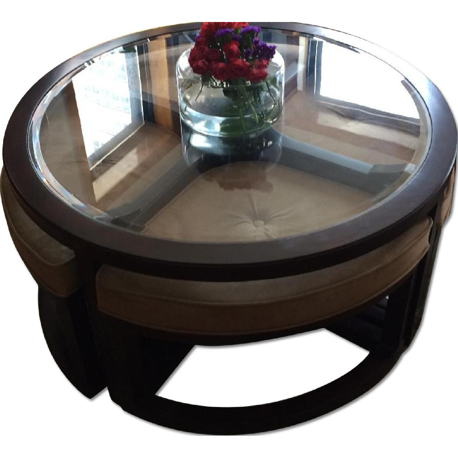 Seller's Notes:This eye-catching glass coffee table with ottomans features contemporary styling that incorporates a clean urban feel. The 4 nesting ottomans feature durable, stain-resistant microfiber seats for added functionality and a unique design that is sure to make the coffee table a conversation piece. Table is used and in good condition. Dimensions: Table: L: 40" x W: 40" x H: 20 Ottomans: L: 26.5" x W: 16" x H: 18" (each) Color: Camel Fabric Fabric: Microfiber Hardwood solids: Coffee table and ottomans are carefully crafted of durable hardwood solids and all wood products with a gorgeous mink brown finish for extra strength and stability Tempered glass tabletop: 5mm tempered glass tabletop with 1 in. bevels gives the coffee table style and an easy-to-clean place to set food and drinks Coffee table includes: 4 Nesting ottomans with durable, stain-resistant microfiber seats