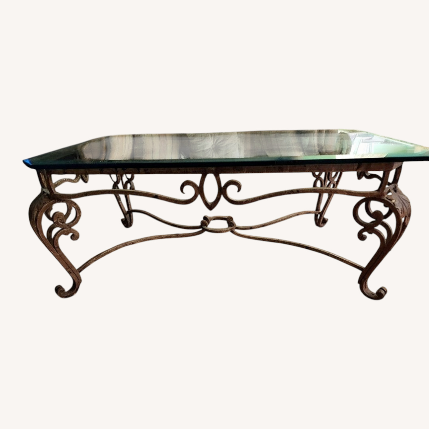 Seller's Notes:My mother collected antiques (depression glass from the early 1900s, etc). She traveled far and wide to do so. She had excellent taste in my opinion. She loved this table with its smooth edges and wrought iron base decorated in gold leaves. I hope somebody else will continue to enjoy it for years to come. It has many good years left!