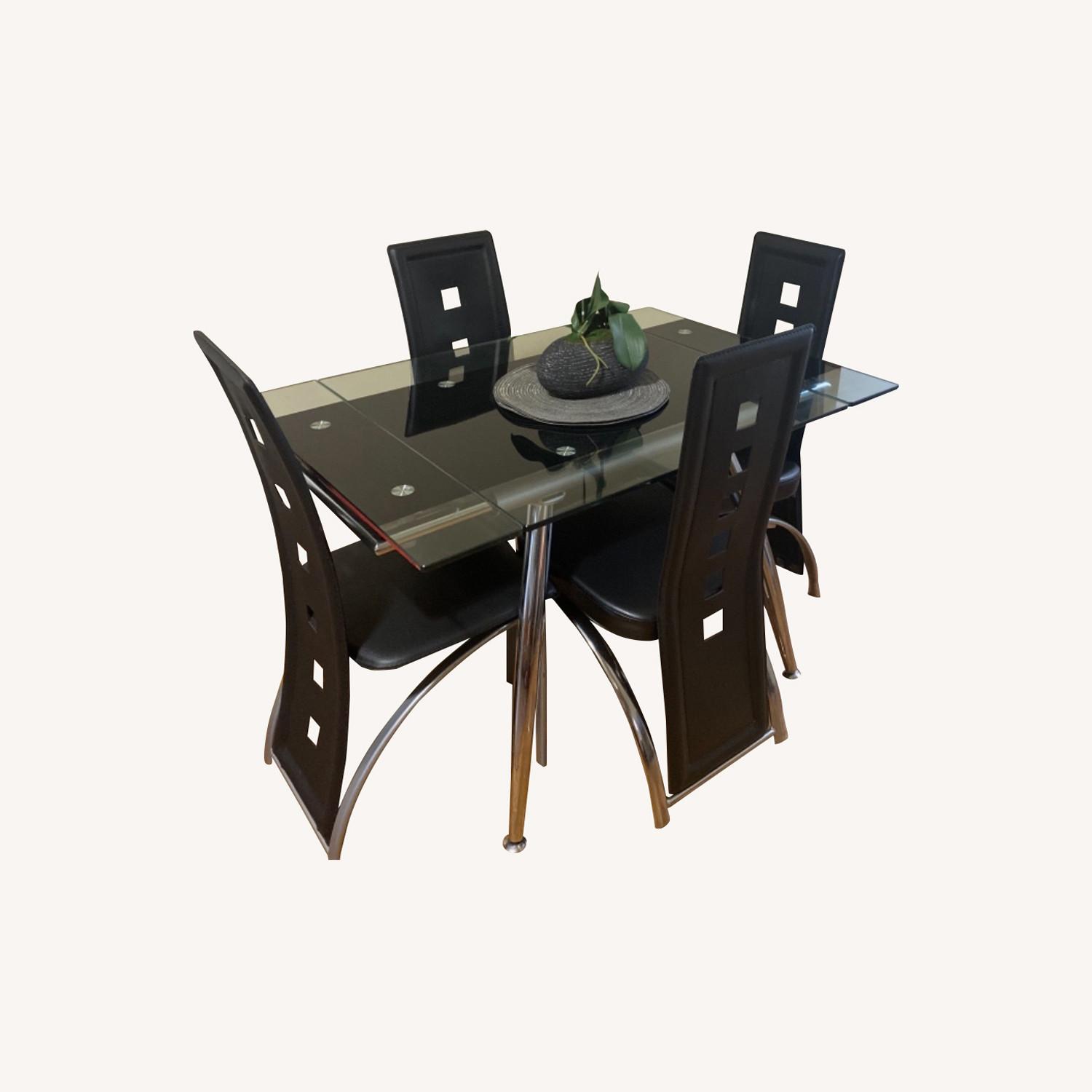 Seller's Notes:Glass dining table equipped with 4 sleek chairs in great condition.