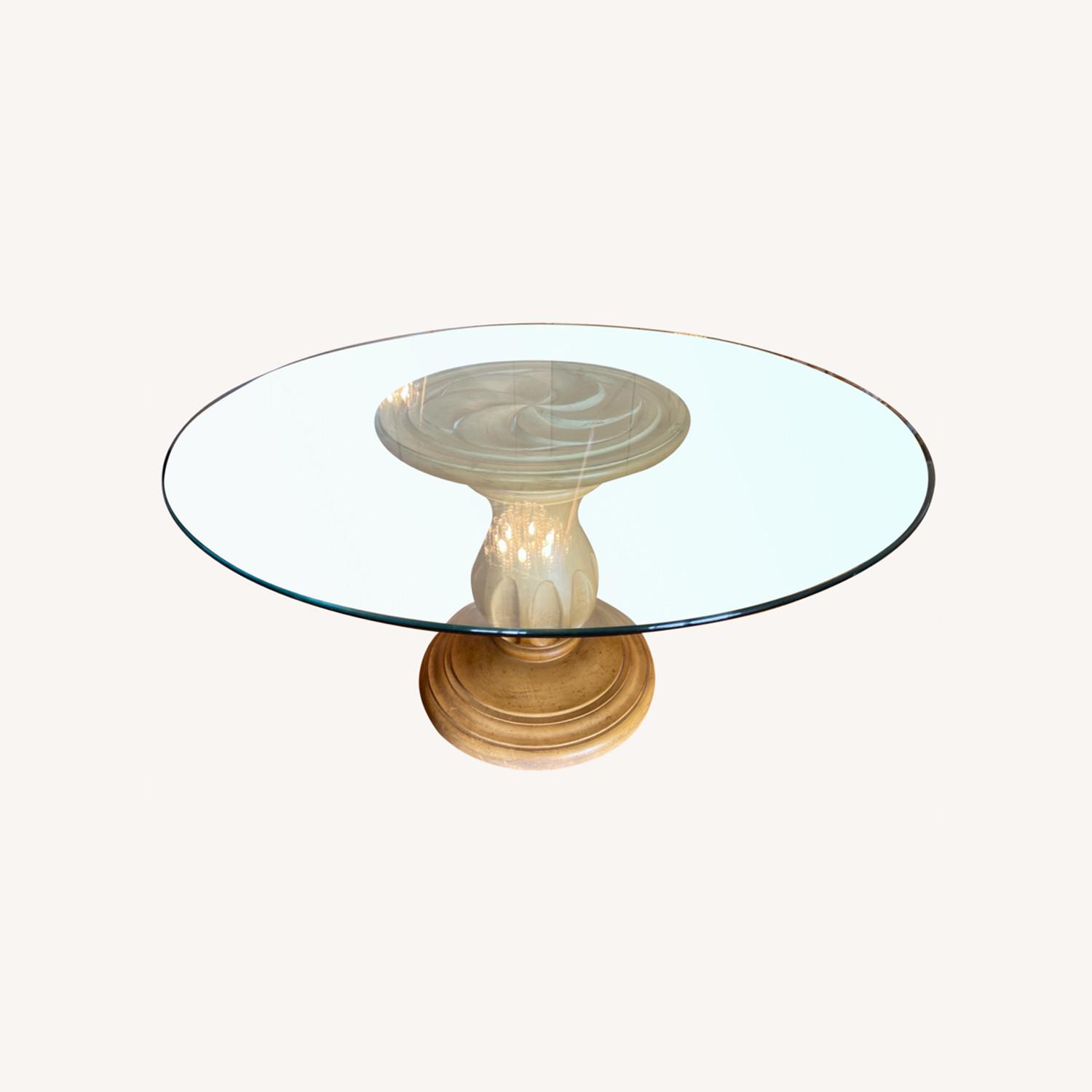 Seller's Notes:54 “ round and 1” thick heavy glass table top. Sits a top of one piece solid wood table stand. A beautiful accent to your dining room. Great deal.