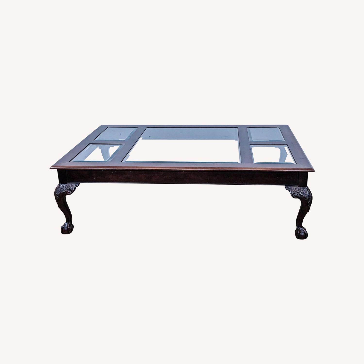 Seller's Notes:Beveled glass insert top on wood frame with carved cabriole legs. Gently used - any blemishes or damage will be included in the photos. #SKU: 1059016. Tags: liquidation,wood,glass