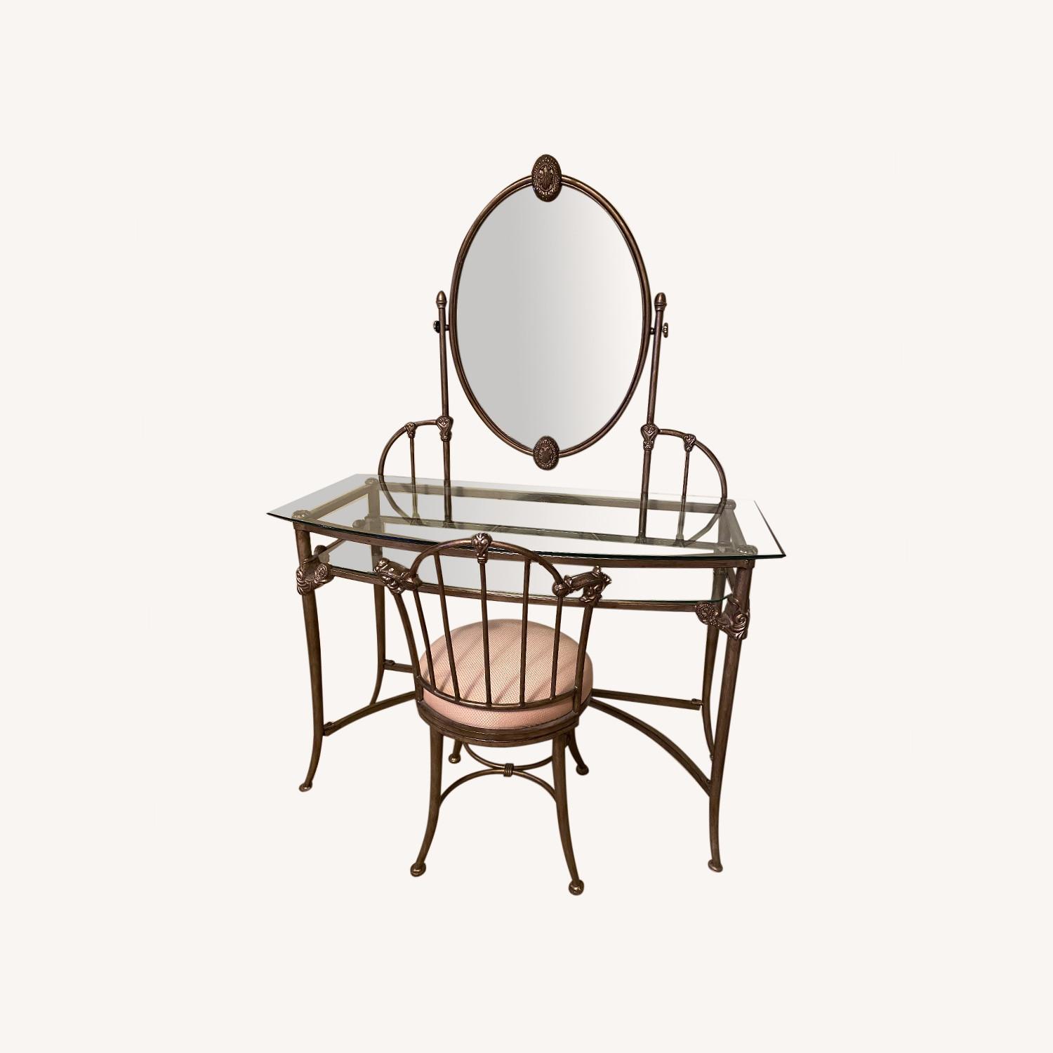 Seller's Notes:Apply your makeup in style at this elegant glass makeup table that sits on a brass-finished base and includes a stylish oval mirror and padded chair. Measures: 45" w x 21" d x 30-5/8" h (63'" to top of mirror)