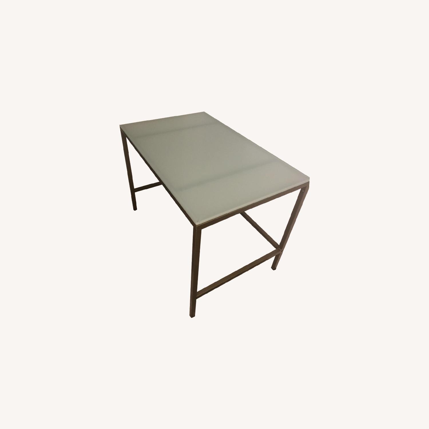 Seller's Notes:- Desk surface is light green/aqua sea glass. Semi opaque. - Legs are light bronze metal. - Feet are adjustable if your floors aren't level.
