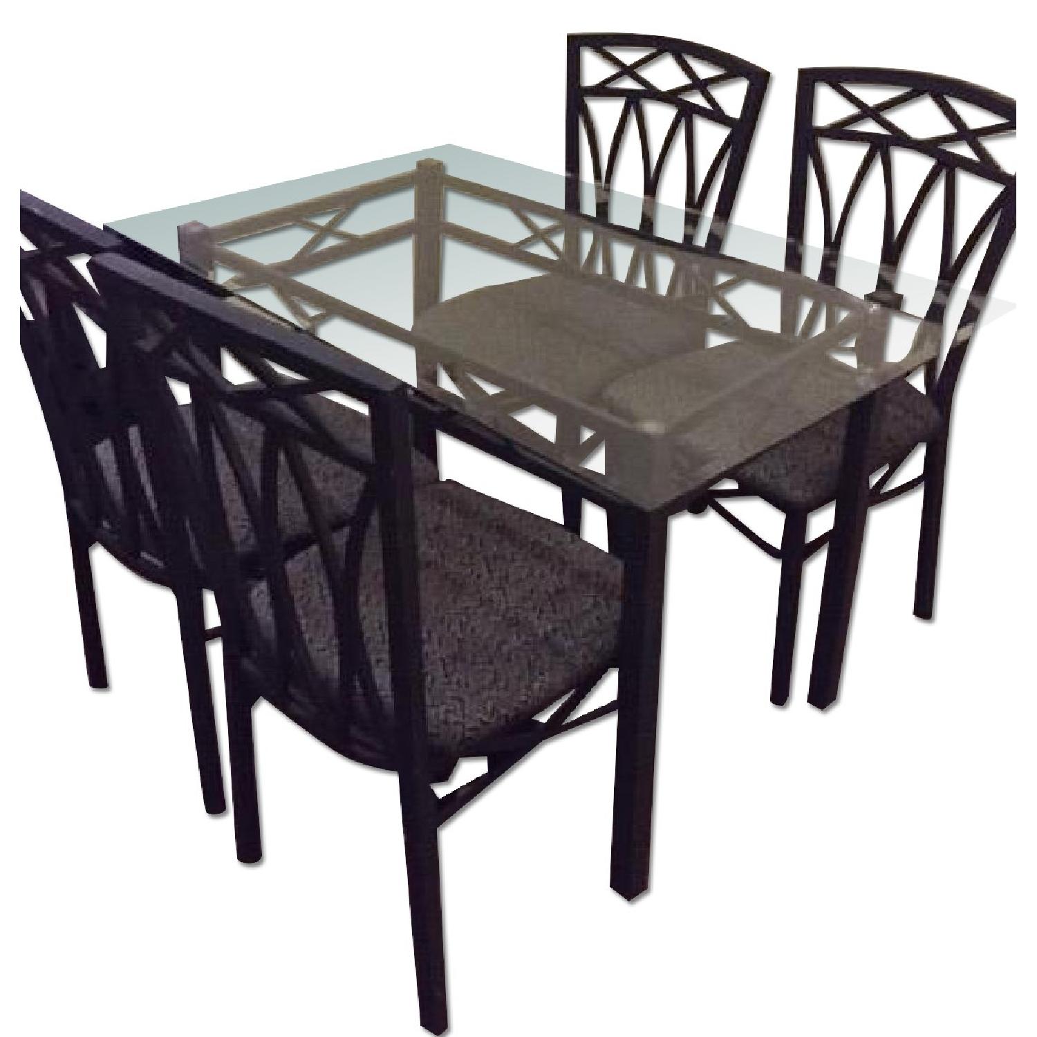 Seller's Notes:Glass dining table - beveled and tempered glass top, black metal frame, 4 black metal chairs with padded fabric seats. The texture on the metal is a little rough, kind of like sandpaper - these chairs would be at home on a terrace as well as inside. Table could seat six if you had enough chairs. Glass is perfect; two bolts have come out of the frame in one corner, so I taped it together (see the photo). The table is sturdy; if you move it, you just have to move it with two people or lift the glass off first. The fabric on the chairs could use a good cleaning. We're moving to a smaller apartment with no space for the table and chairs. I don't remember the original price, and I have no idea what the brand is.