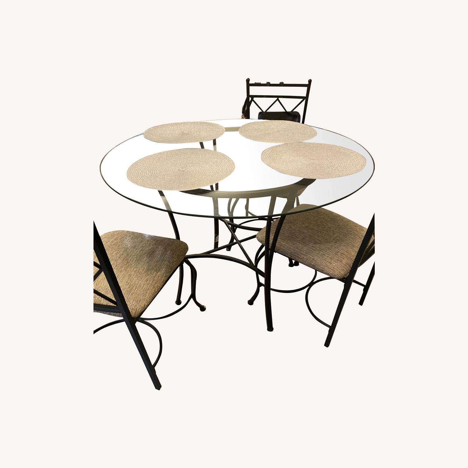 Seller's Notes:Round glass table with iron base. Less Than a year old. 4 matching chairs included . Comes with extra pieces for repairing . In great condition