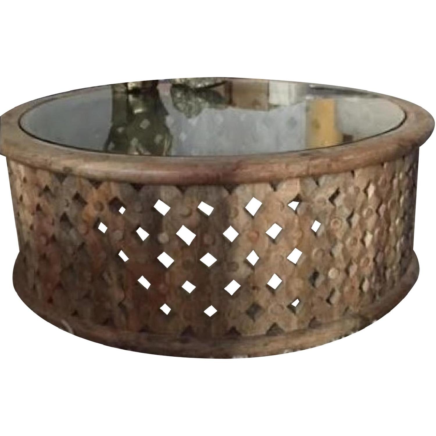 Seller's Notes:Perfect coffee table with personality! Ethnic chic style, absolutely perfect condition. Carved wood base, glass top.