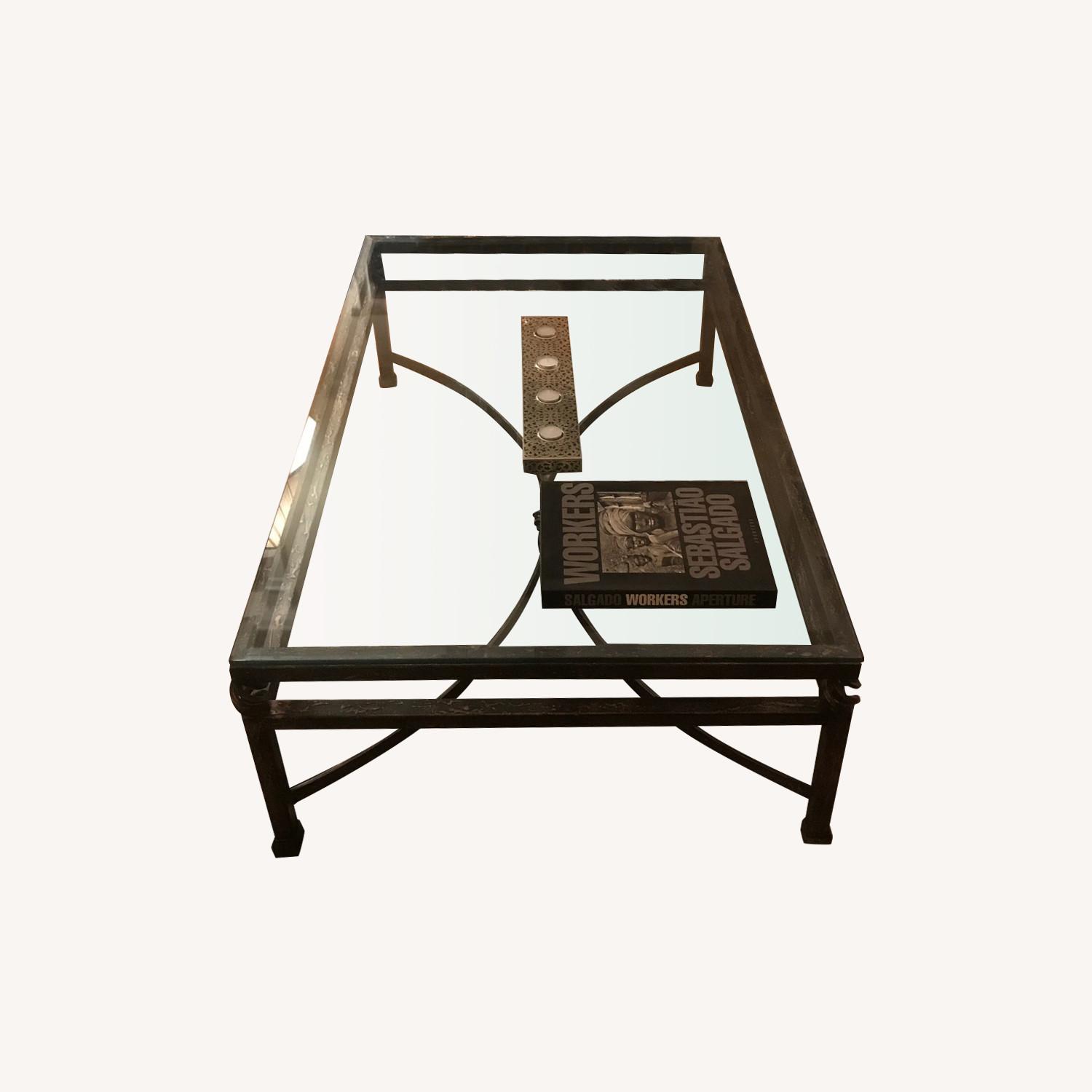 Seller's Notes:Lovely, iron-based glass-top coffee table. Large: 54" Length, 34" Width, 16" Height. No chips/blemishes. Perfect condition. Moving to Florida. Located on Upper East Side.
