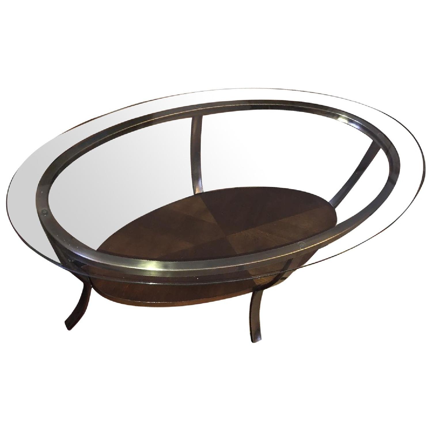 Seller's Notes:Glass top oval coffee table with wooden shelf to display collectibles, pictures or other items. Set includes two (2) side tables. Side tables features rounded glass top with wooden display shelves.