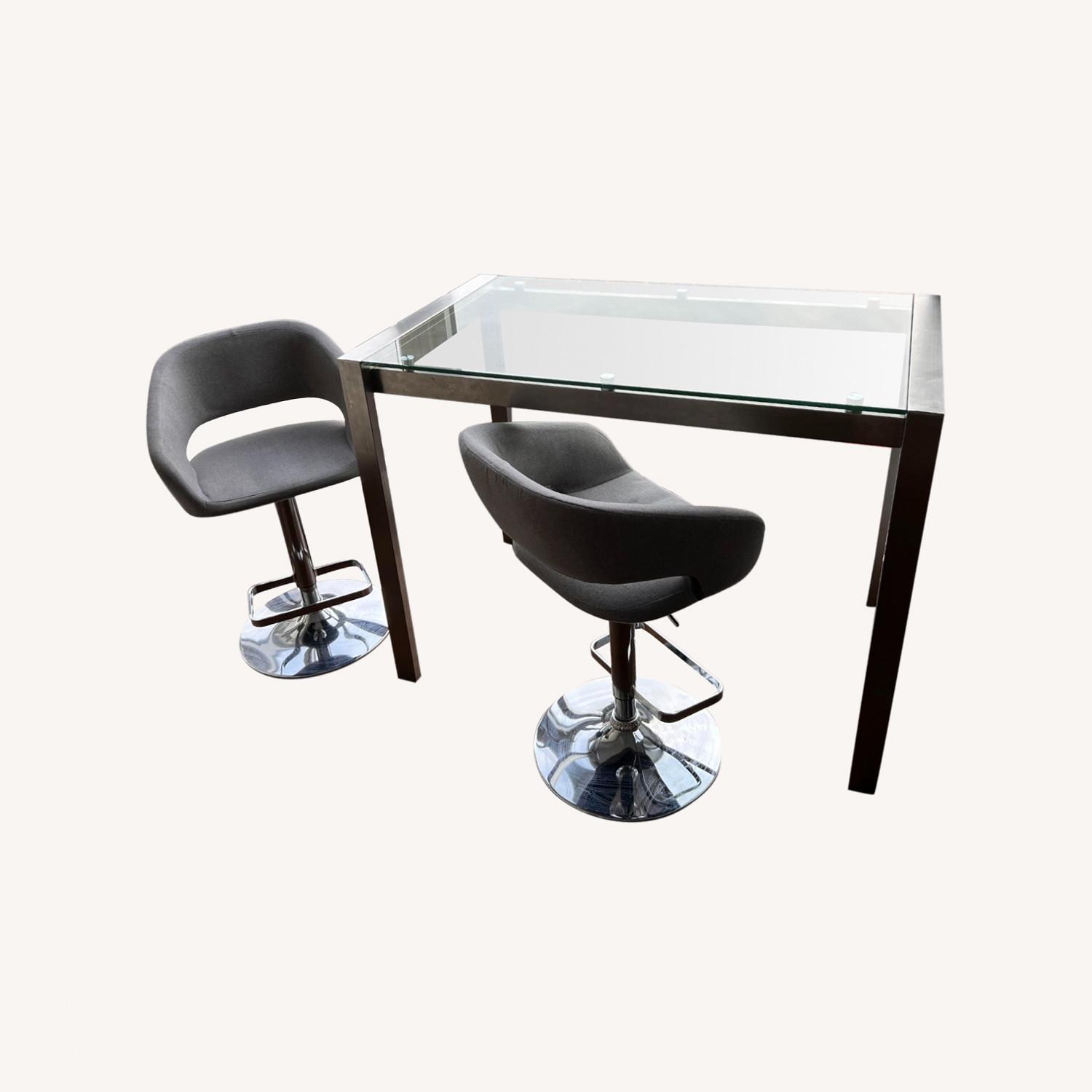 Seller's Notes:Counter-height dining table Material is glass and stainless steel, therefore no scratches or other blemishes. Purchased a year ago, selling as part of move out. Good for up to 4 people. Set of 2 swivel upholstered adjustable height bar stools. Light gray color.