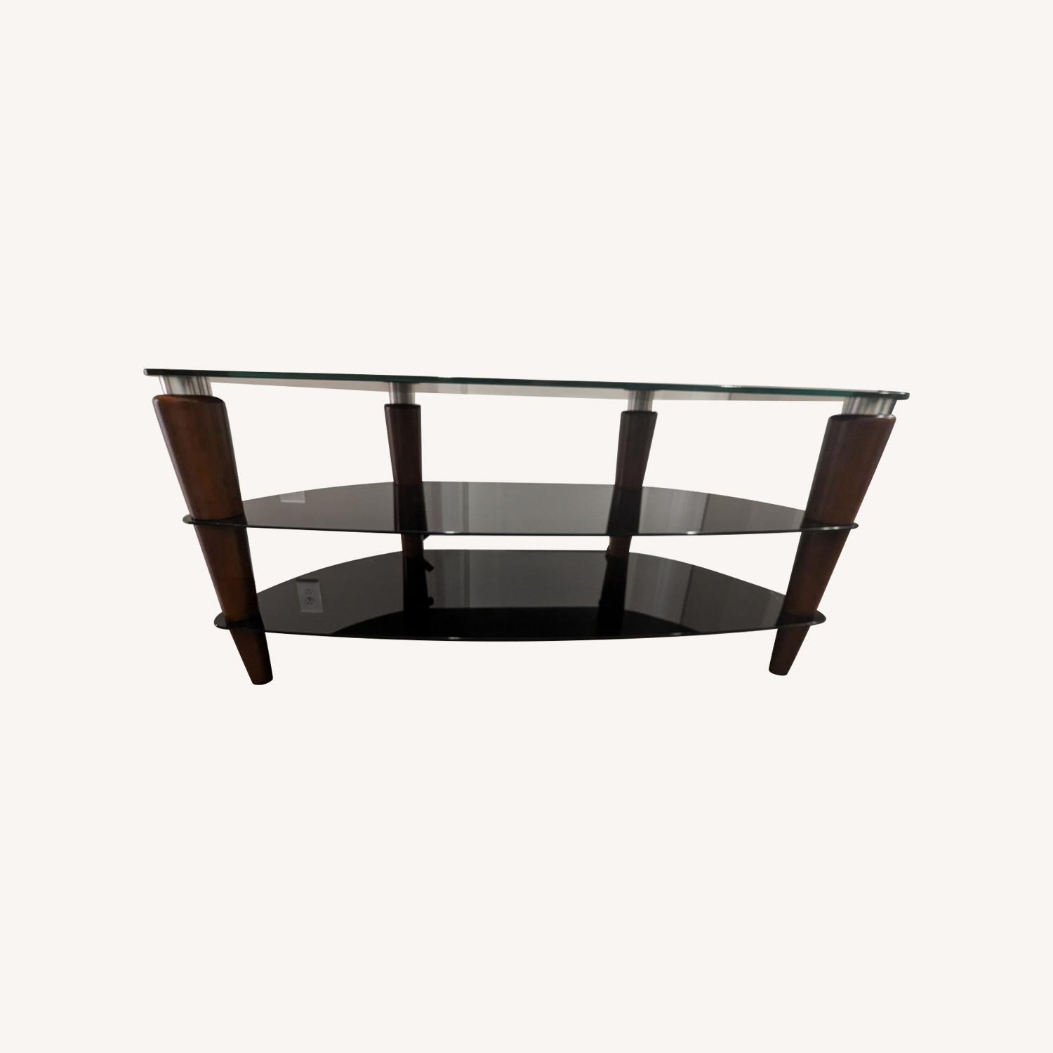 Seller's Notes:This TV stand I purchased for my 38-inch television has significantly enhanced the aesthetic of my room, imparting a vintage charm that I find appealing. Its design features a combination of wood and glass elements, which not only supports the TV securely but also complements my existing decor. The stand's dimensions are perfect for the space, allowing for additional storage without overwhelming the room.
