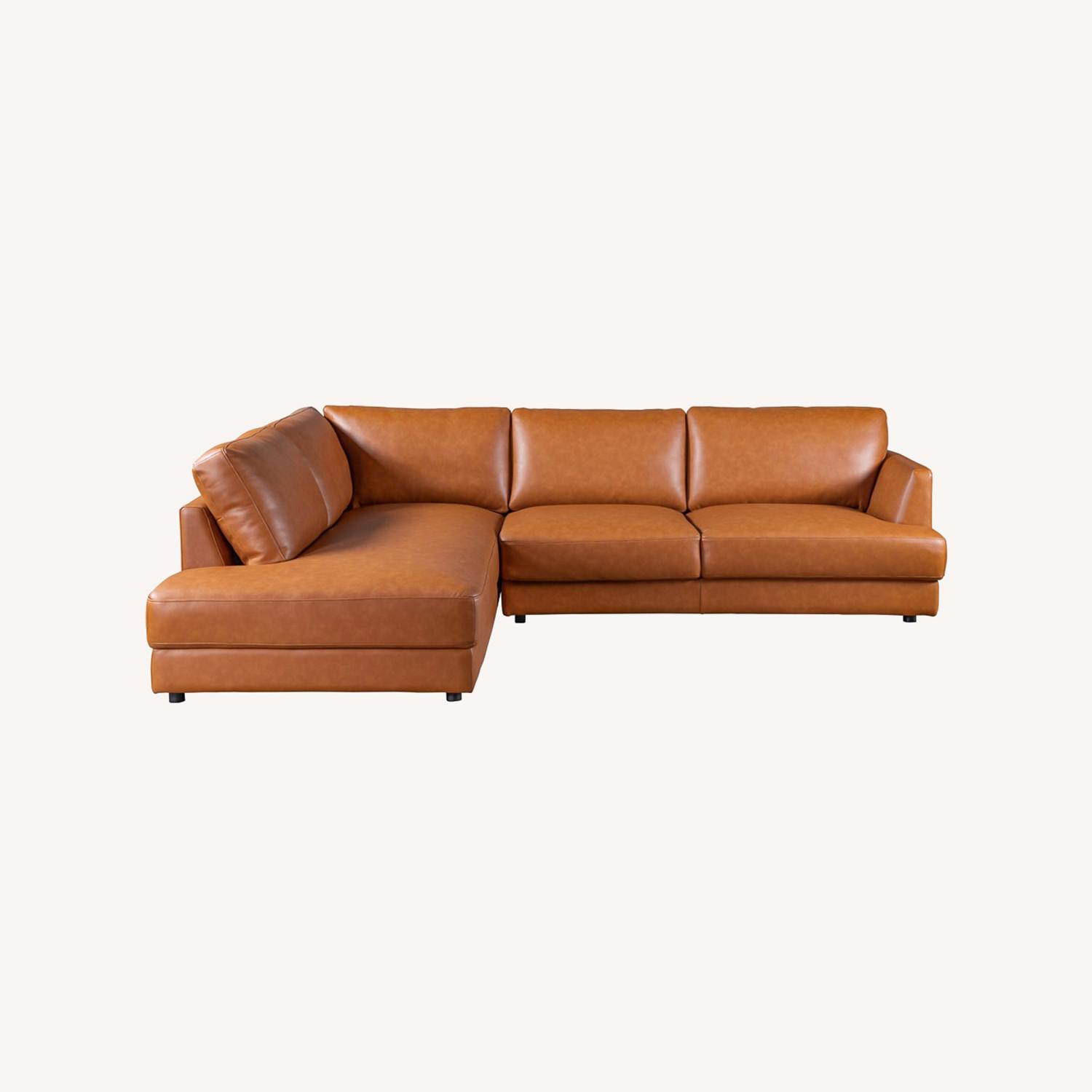 Seller's Notes:The Glendale Sectional combines modern aesthetics with thoughtful functionality, redefining contemporary living. Upholstered in cognac composite leather, this sofa offers the perfect synergy of luxury and practicality—a durable blend of natural fibers and synthetic materials that mimics the elegance of genuine leather while ensuring easy maintenance. Its L-shaped design comfortably seats five adults, making it an ideal centerpiece for gatherings or quiet evenings at home. The loose back cushions and generous seat depth promise unparalleled comfort, while the sleek, ergonomic build supports both style and relaxation.