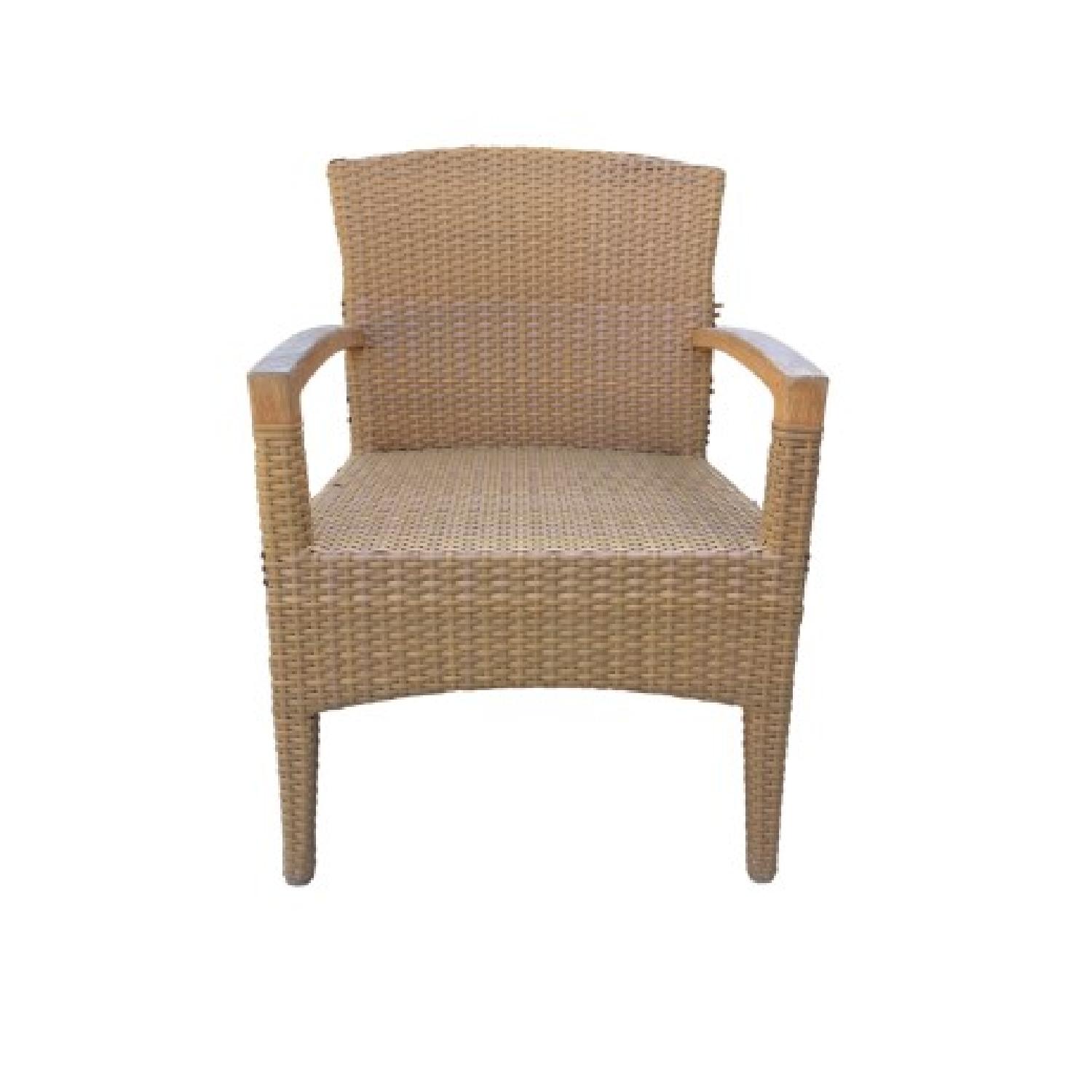 Seller's Notes:Gloster is known for thoughtfully crafted outdoor furniture pieces that set a mood. These outdoor dining chairs take a natural approach to outdoor living. The design’s woven all-weather wicker is elevated with teak wood arms, adding organic appeal to your modern patio furniture scheme. Sold in a set of two. Cushions included. Woven all-weather wicker. The teak arms show normal weathering. Red cushions have subtle wear on seat edge.