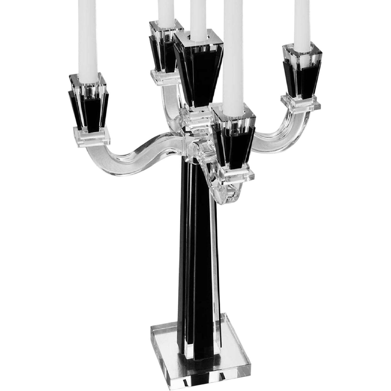 Seller's Notes:Description: Art Deco Five Arm Candelabra: Five-light crystal candelabra with a square foot Features four arms, one central pillar and candle cups Requires five standard taper (not included) Measurements: 13½" SQ x 19" H Material: Crystal Care: Wipe with a damp cloth Brand: Godinger Origin: Imported