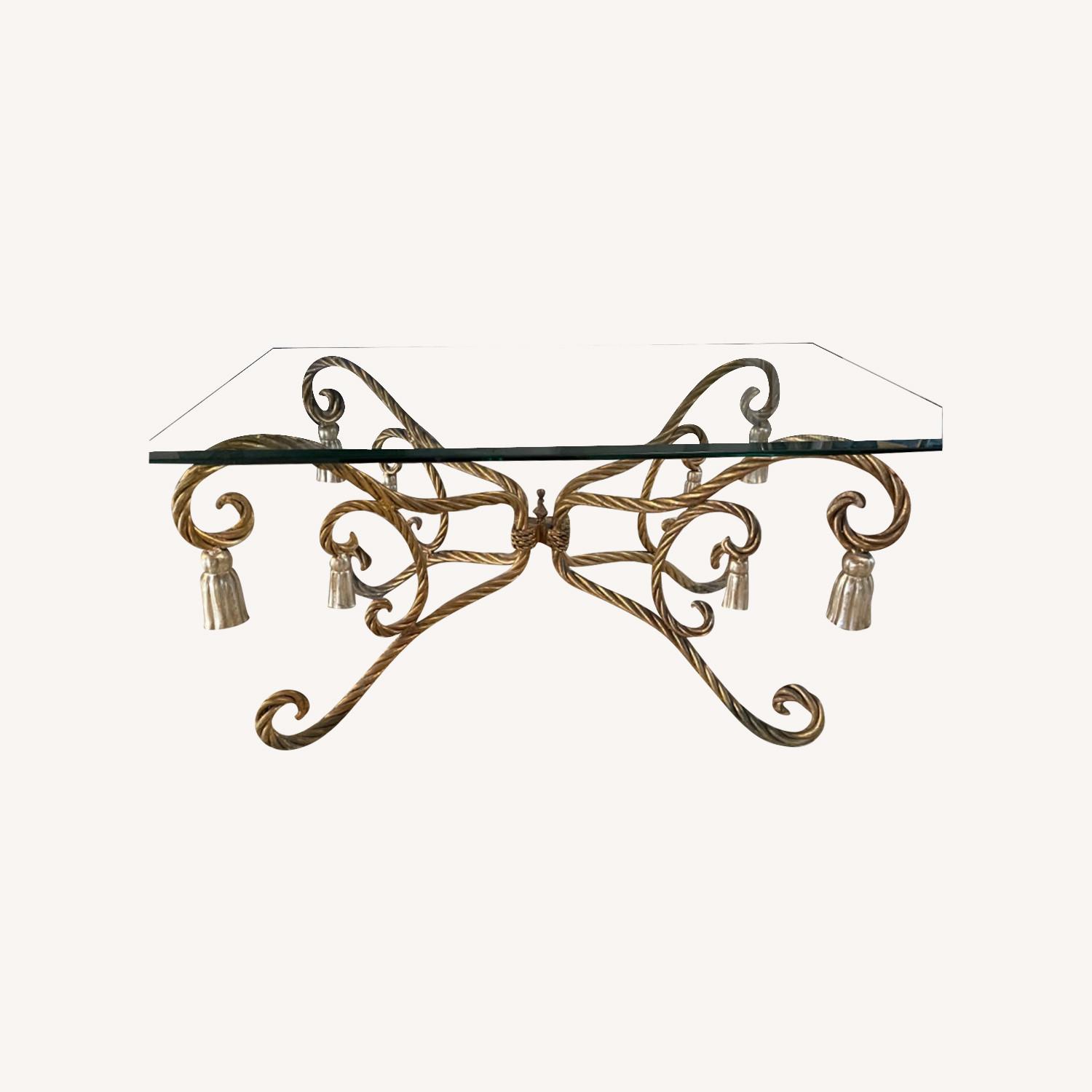 Seller's Notes:Cocktail table Glass top with gold leaf base and tassles on all sides in great condition
