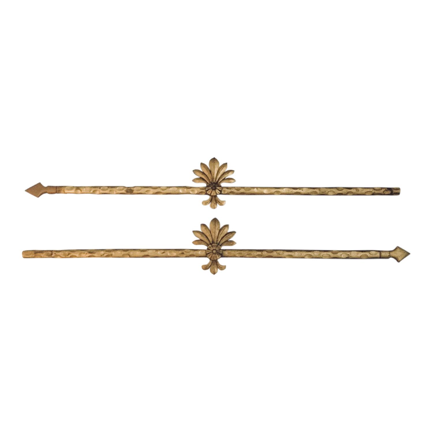 Seller's Notes:Bringing a rich feel that exudes opulent style and is a stunning statement piece for any room. In the center of each of these beautiful hand carved wooden curtain rods is a decorative hand carved medallion. The entire two pieces have a vintage gold gilded finish due to age. These curtain rods can be used as one single piece by connecting the two rods in the center. Can also be used as individual rods for two separate windows. Also can be used for hanging tapestries or textile wall art. Hanging brackets/ hardware and rings are not included. Curtain Rod specs- 46"(without the finial) Finial 4" Pole diameter 1" Center Medallion 8'