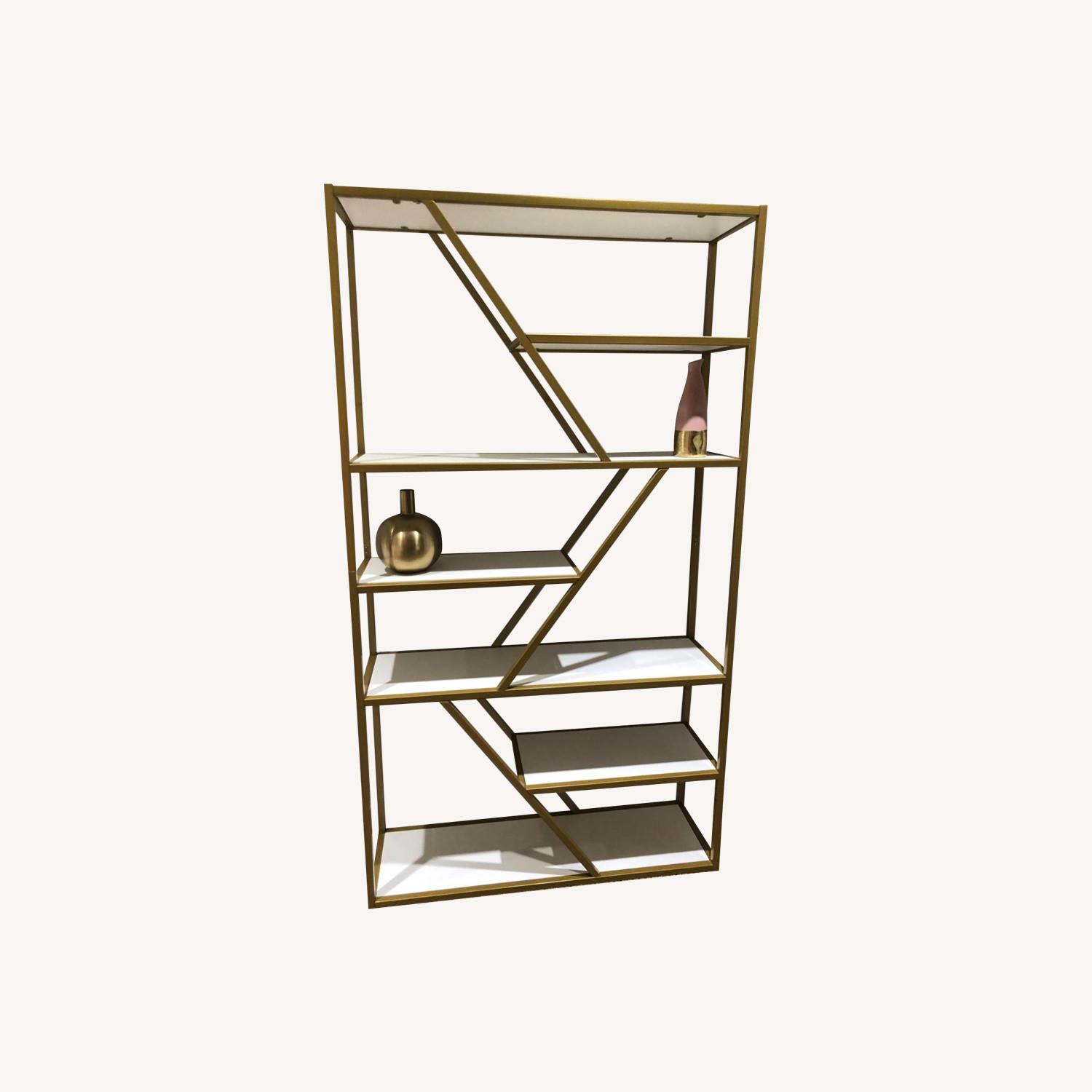 Seller's Notes:Perfect for showcasing or using as office storage. One minor stain inside top shelf from a candle (picture shown). Could easily cover with marker. Gold metal frame and white board design provides a aesthetic feeling and huge storage space, display cabinet makes a striking and functional room divider Use as a bookshelf, room divider, display rack and plant stand. It blends well into the environment and adds an extra pop of style to your home decor Waterproof and sturdy, it can be placed in the living room, study and bedroom. Add a modern feel to your home improvement while solving storage problem