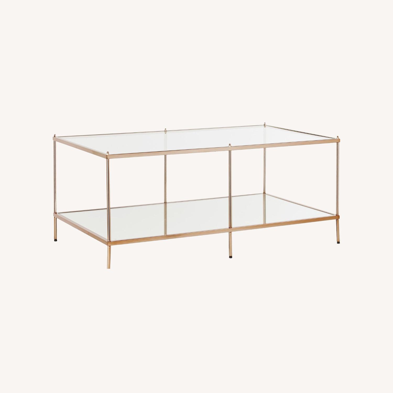 Seller's Notes:Coffee table includes glass top, gold accents, and mirrored bottom. Is the perfect height for a mid century modern couch. Inspired by the glamour of Hollywood's Golden Age, the Aurora coffee table features a luxe mirrored shelf and clear glass surface framed in sleek metallic gold. A two-tier centerpiece with an art deco-style silhouette straight out of the 1920s, it provides spacious storage for living-room essentials with a streamlined footprint. Its shimmering mirrored shelf brightens a room, showcasing your decor and reflecting your good taste. Overall: 42.25"W x 24"D x 19"H, 40 lbs. Shelf: 42.25"W x 24"D Distance between shelf and tabletop: 12.5"H