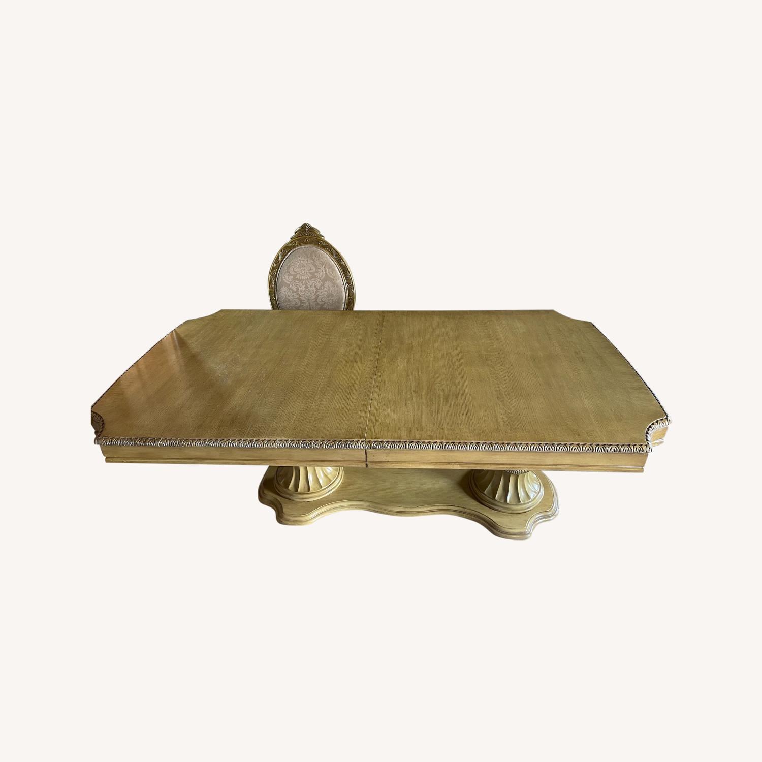 Seller's Notes:Designed for a larger living room area, this set includes a table (comes with a leaf extension), and six chairs (2 captains chairs) The set has had only one owner and has been in the same location for over 10 years. Very little wear and tear on the table. The chairs are in fair condition. Each item is heavy! A testament to the wood that was used to create the set.