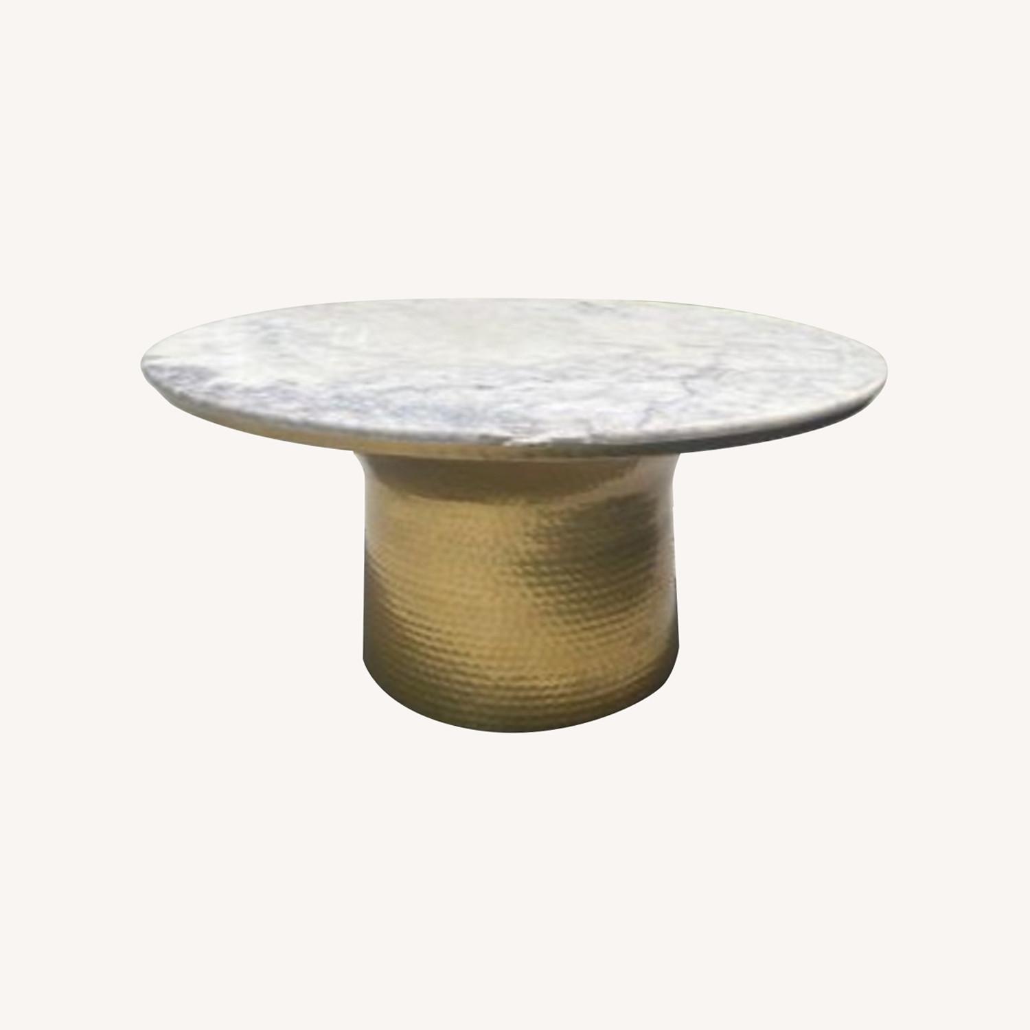 Seller's Notes:-Modern round coffee table -Hammered metal pedestal base topped with creamy marble