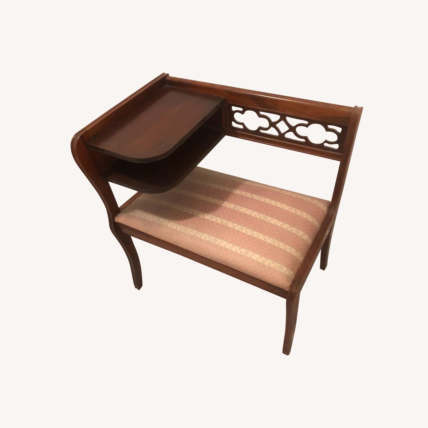 Seller's Notes:This is a gossip bench. It is meant to hold a telephone and a phone book. It has some scrapes and I believe it is missing wooden knobs that cover the screw holes. The fabric seat is in very god condition. Very little to no wear.