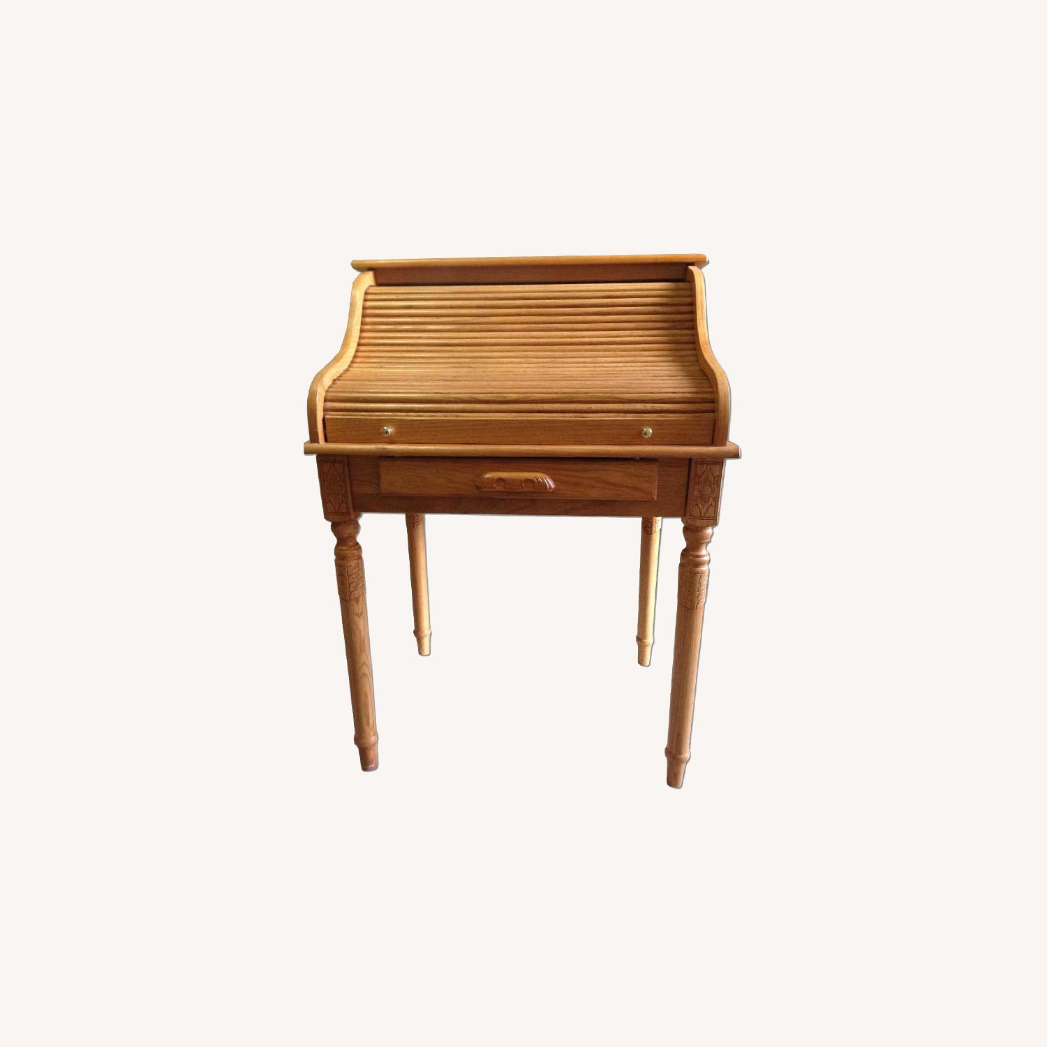 Seller's Notes:Oak roll-top desk. 32.5 inches wide, 24 inches deep, 44.5 inches tall. In very good condition. Lovely carved designs on the legs. Good for monitor & keyboard or as a writing desk. Used for 10+ years, but still in very good shape.