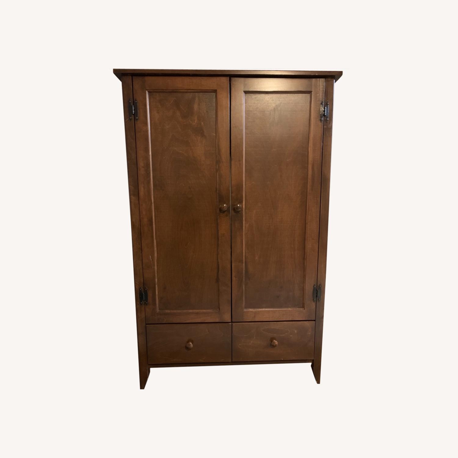 Seller's Notes:Beautifully stained handmade wooden armoire originally purchased at Gothic Cabinet Craft in NYC. Excellent condition with two widely opening doors, a sturdy rail for hanging items and two large drawers underneath. Has been maintained well. Selling only due to our need for a larger armoire.