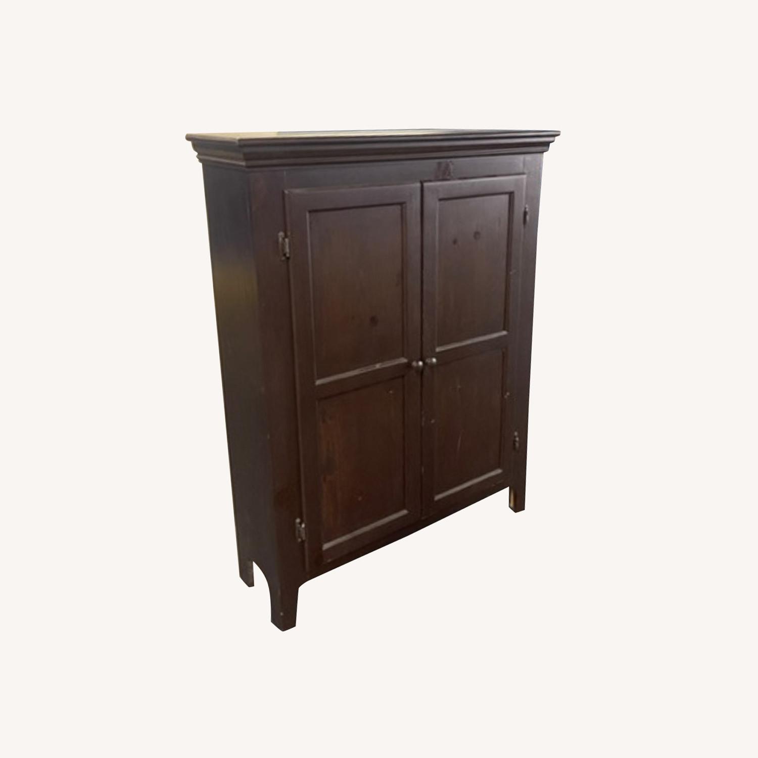 Seller's Notes:Gothic Cabinet Craft of New York hand builds unique wooden furniture. This piece is a slim cabinet with two doors on the front which they call their "jelly cabinet." Apparently they have a pantry function in mind, but it also works well for books, office supplies, or as an entertainment console. It creates the impression of being a substantial piece of furniture, while at the same time being surprisingly compact. Protruding only 13 inches from the wall, it is ideal for small spaces where you don't want to overcrowd the room with large furnishings. It has three interior shelves that can be positioned as you like. I used this one as an entertainment console when I lived in a small Manhattan apartment. A 20 inch flatscreen TV fits perfectly, with room for speakers and books below. This item retails for 639 at Gothic Cabinet Craft, unfinished. For the finished piece it costs 808. The stain I chose is a handsome, dark color. I believe it is the finish they call Special Walnut. This is a used item. It has a few minor dings and scratches. I made a hole in the back at the bottom to accommodate power cables for a television and some speakers. The hole is rough-hewn and could stand to be cleaned up/finished a little better, but it on the backside and doesn't show when the cabinet is in use.