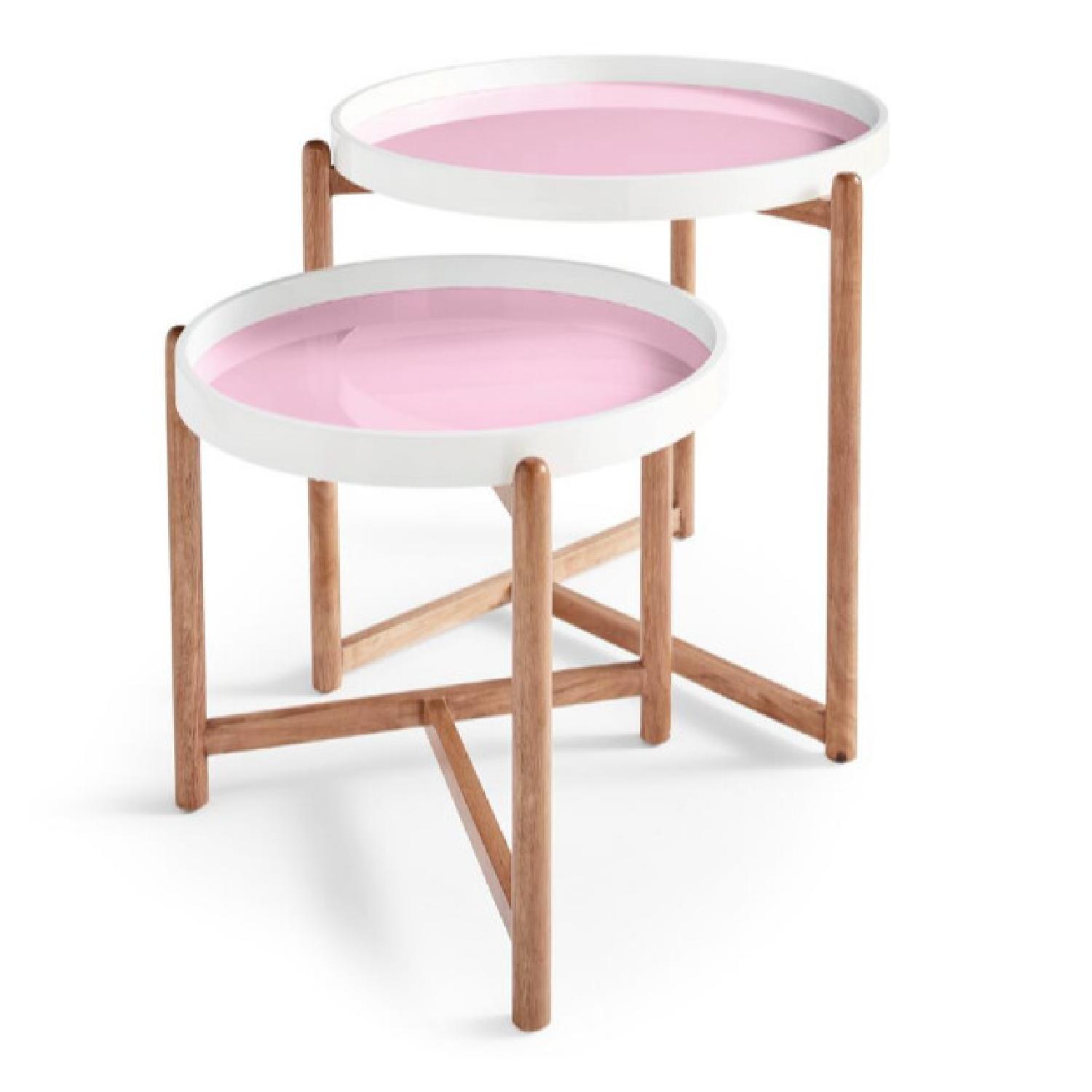 Seller's Notes:Cute and super functional for NYC apartment living. I have only owned this set for 5 months and really only used the smaller of the two tables and the set is in like-new condition. Only very minimal scratches on the face of the tops which are not at all noticeable. Very sturdy -- came fully assembled and bases are made of real wood! / Description: A rounded solid wood base holds color-infused, lacquered tray-style tops (you can use them on their own) in on-trend fashion tones with white rims. The smaller table tucks under the larger table for compact storage while using the duo as a side table option. The set includes one small and one large table. / Small table with tray top: 18" dia. x 20"H Large table with tray top: 22" dia. x 24-1/2"H / Retail price: $299 for the set