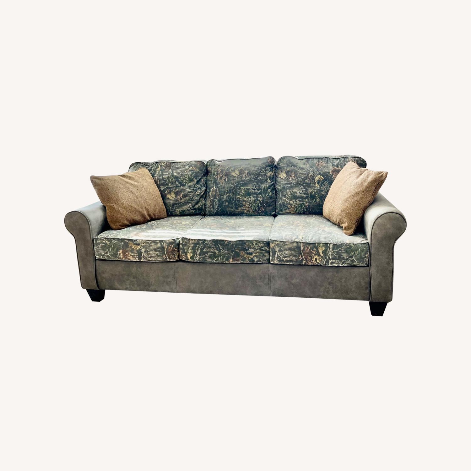 Ultimate comfort for those that want to make a statement of love for the outdoors. Superflauge camouflage seating areas on the inside with supple vegan leather on the outside for the rugged individual with style. This sofa offers rolled transitional arm styling with three over three reversible cushions for long wear. Woodsy fabric colors with dark brown accent. Will fit into a smaller size floor plan in a cabin or rustic style home utilizing outdoor decor. Seats three comfortably.