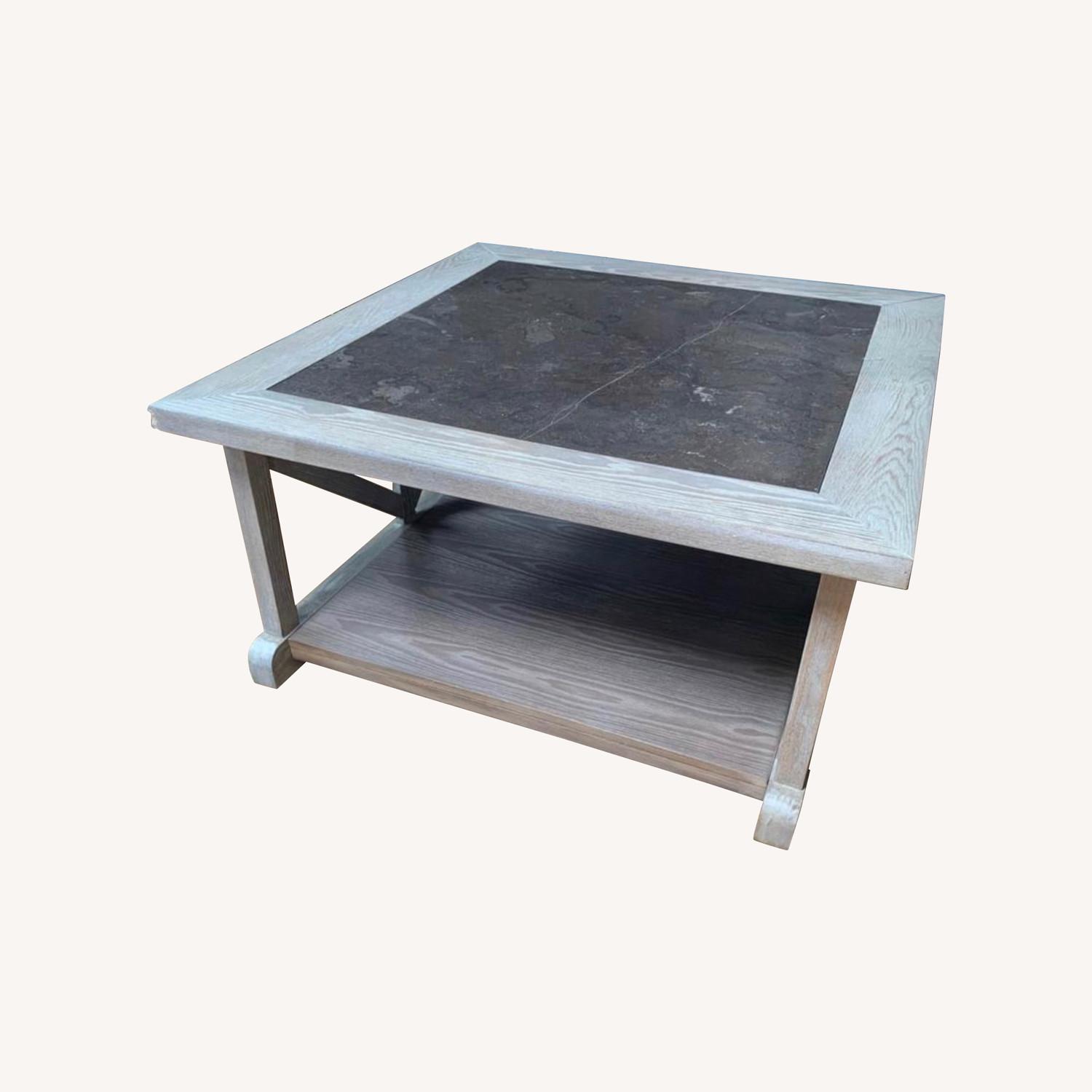 Seller's Notes:Fabulous square wood and marble coffee table. On wheels and has lower shelf for storage. There is a small chip on one corner and some light scratching on the top (hardly noticeable with the marble pattern), but otherwise in great condition. I love it but have redecorated my space and going for a new aesthetic.