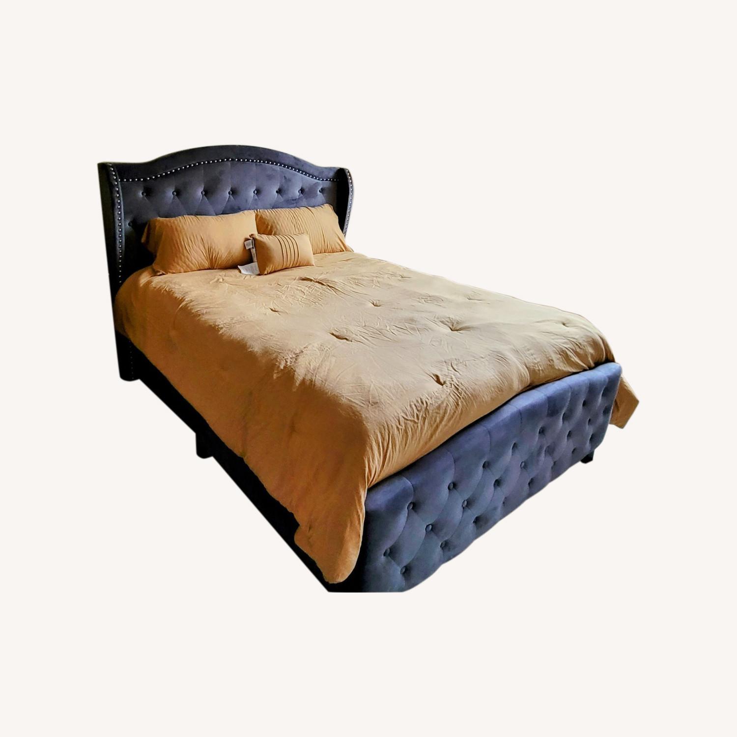 Seller's Notes:Grey polyester fabric on a solid wood frame. Velvet to the touch headboard and footboard. Wingback silhouette, button tufting and nailhead