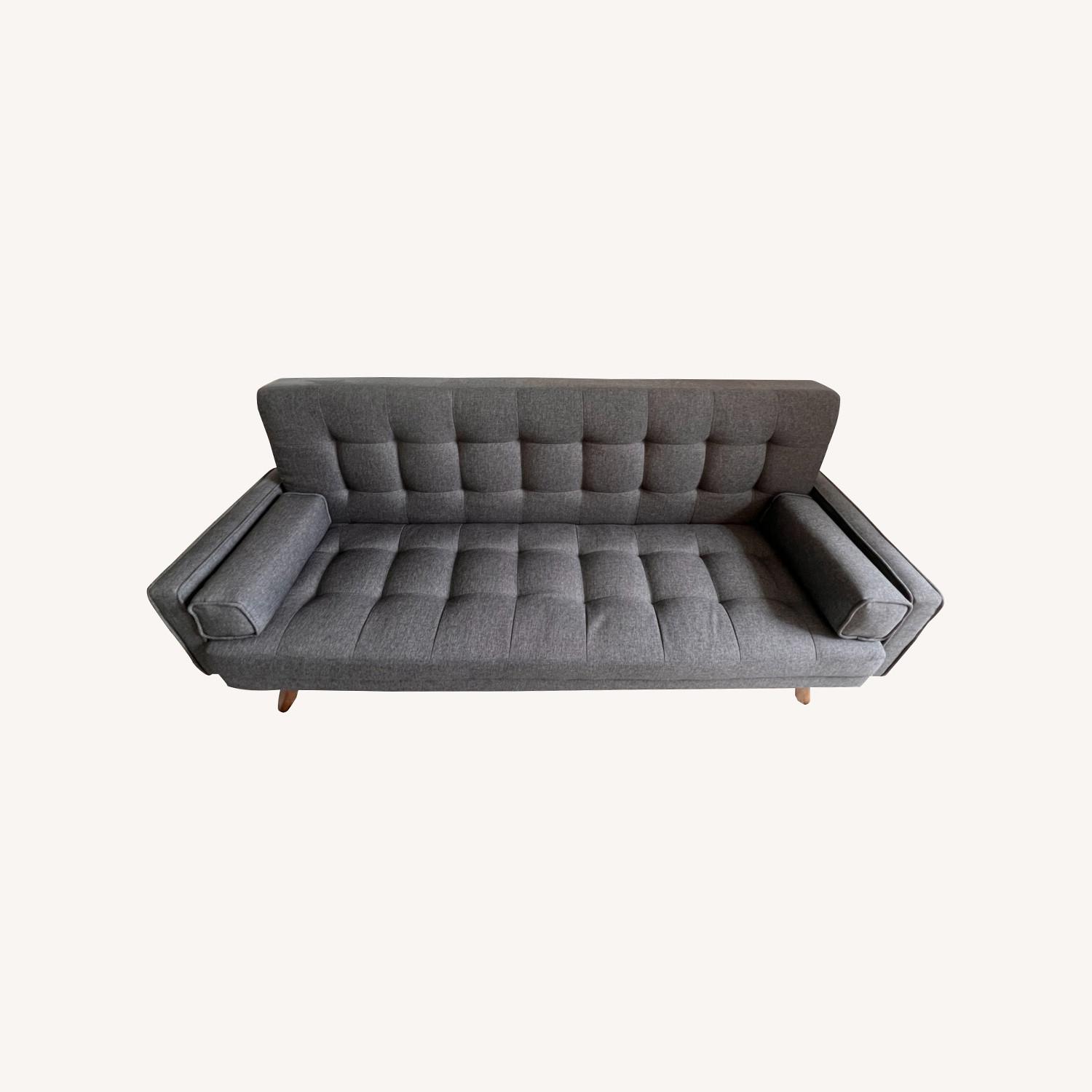 Seller's Notes:This great futon has been with me for almost two years. It is firm and comfy. It can be converted to a sofa bed easily. Would love to pass it over to the next owner. FIRM MODERN FEEL: A firm to medium comfort is a great addition for any living space with modern, linear box tufting GREAT FOR LIMITED SPACE: This stylish piece of futon furniture is versatile for homes with limited space such as apartments and a college dorm STYLE YOUR HOME: Choose between three different upholstered options for the futon and frame: faux leather, velvet, or linen-inspired with a variety of colors for personalization FROM SOFA TO A BED: Seamlessly swap between comfortable seating, to sleep positions for overnight guests with this adaptable piece of furniture. The flat futon position closely resembles a Twin Bed in size. REMOVABLE ARMS: The arms of the futon do not go down but are instead removable with an easy slide bracket