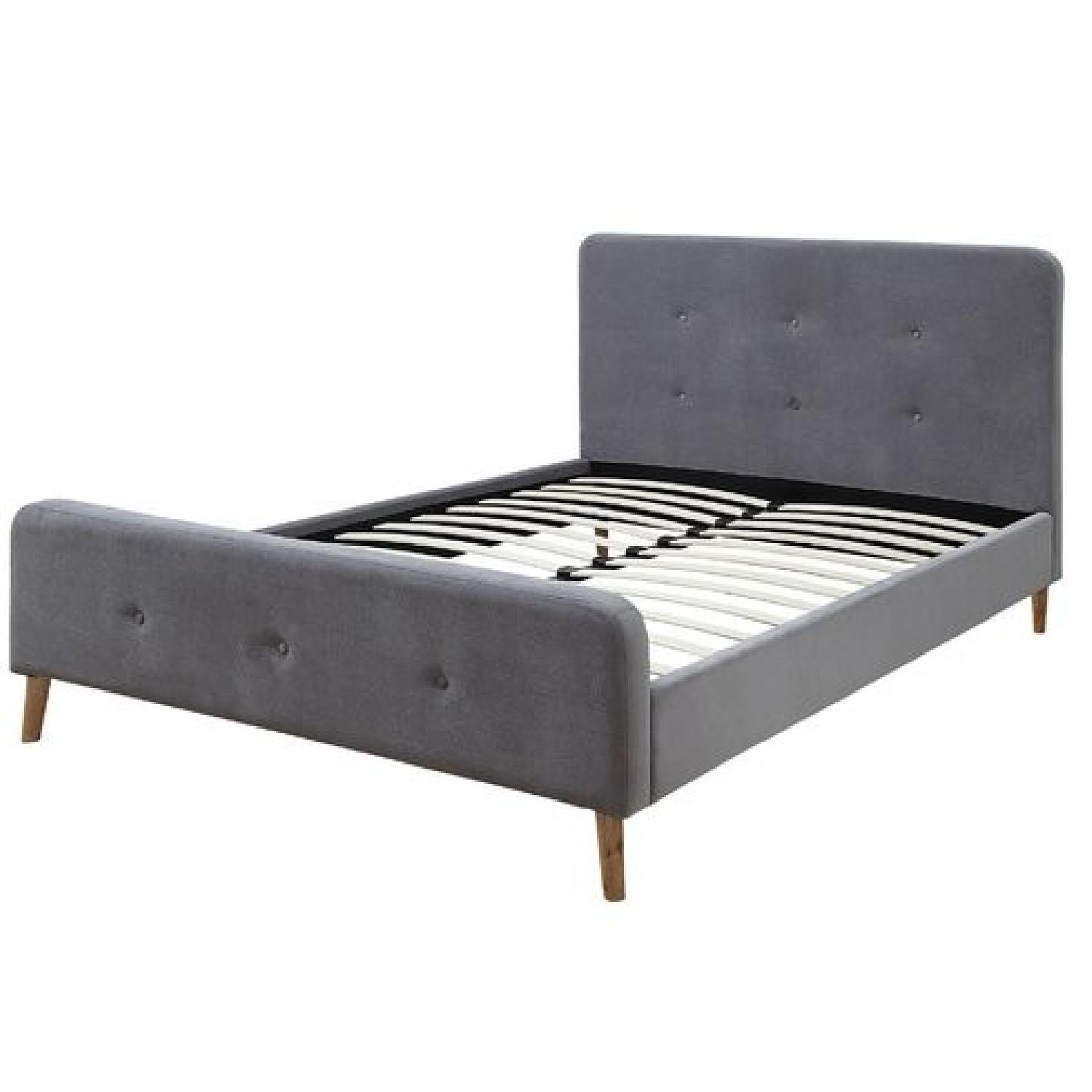 Seller's Notes:Soft gray velvet-like fabric bed up for sale!!! Only 1 month and a few days old with no blemishes whatsoever. I've decided to upgrade to a King, but because the bed has already been assembled (and currently assembled as shown in photos) I cannot return it. This bed is uber great (no box spring necessary). I bought it for the velvet-like fabric and its size - it will works wonderfully in a small space if you have one. Very modern look with wooden legs and strong slat support system.