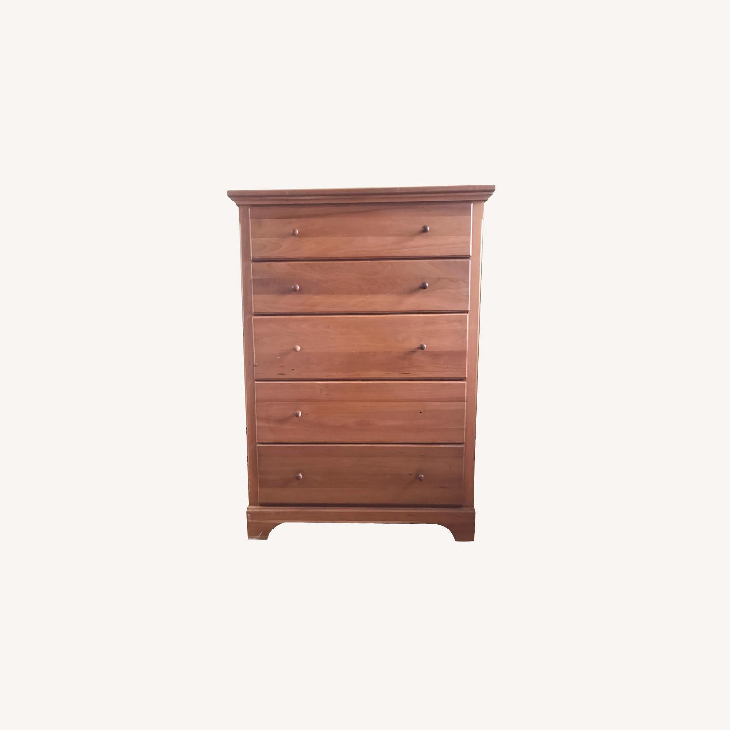 Seller's Notes:Pretty dresser with a few scratches at the bottom but otherwise in good shape. There is one knob missing. this is not a cheap particleboard dresser - it's solid wood. Timeless contemporary design. Fits in a corner but offers lots of drawer space.