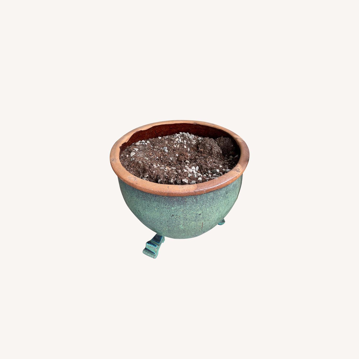 Seller's Notes:Rustic glazed mottled green finish on the exterior, unglazed lip, and brown glaze in the visible portion of the interior. Includes matching feet. I'm liquidating a relative's estate, so the item must be picked up on or before Sun., Sept. 26.