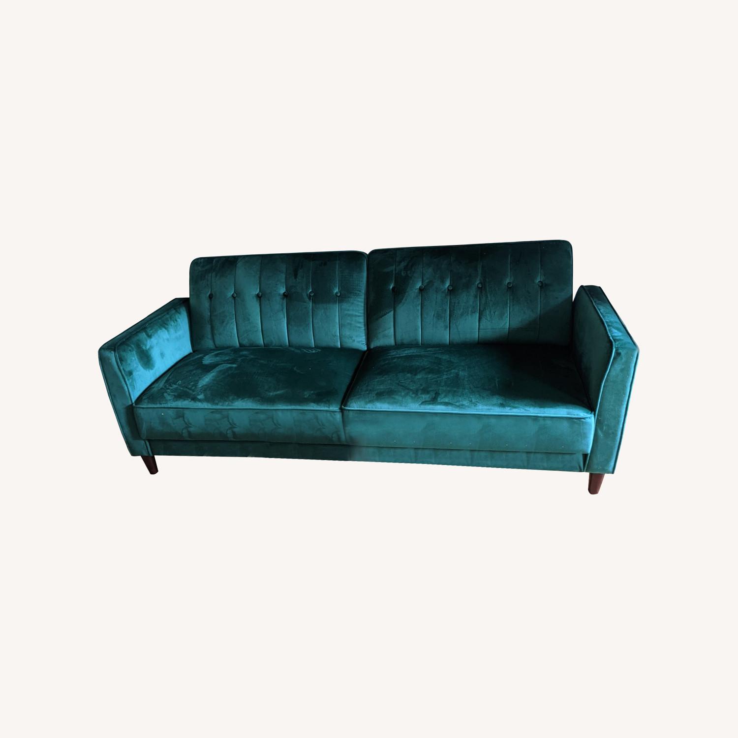 Seller's Notes:Selling my green velvet couch that is also a futon. In great condition. Couch transforms into a full size bed. Perfect for studio apartments. Only a year old. Dimensions: 81.5” long x 68” wide You must be able to transport from apartment. No deliver