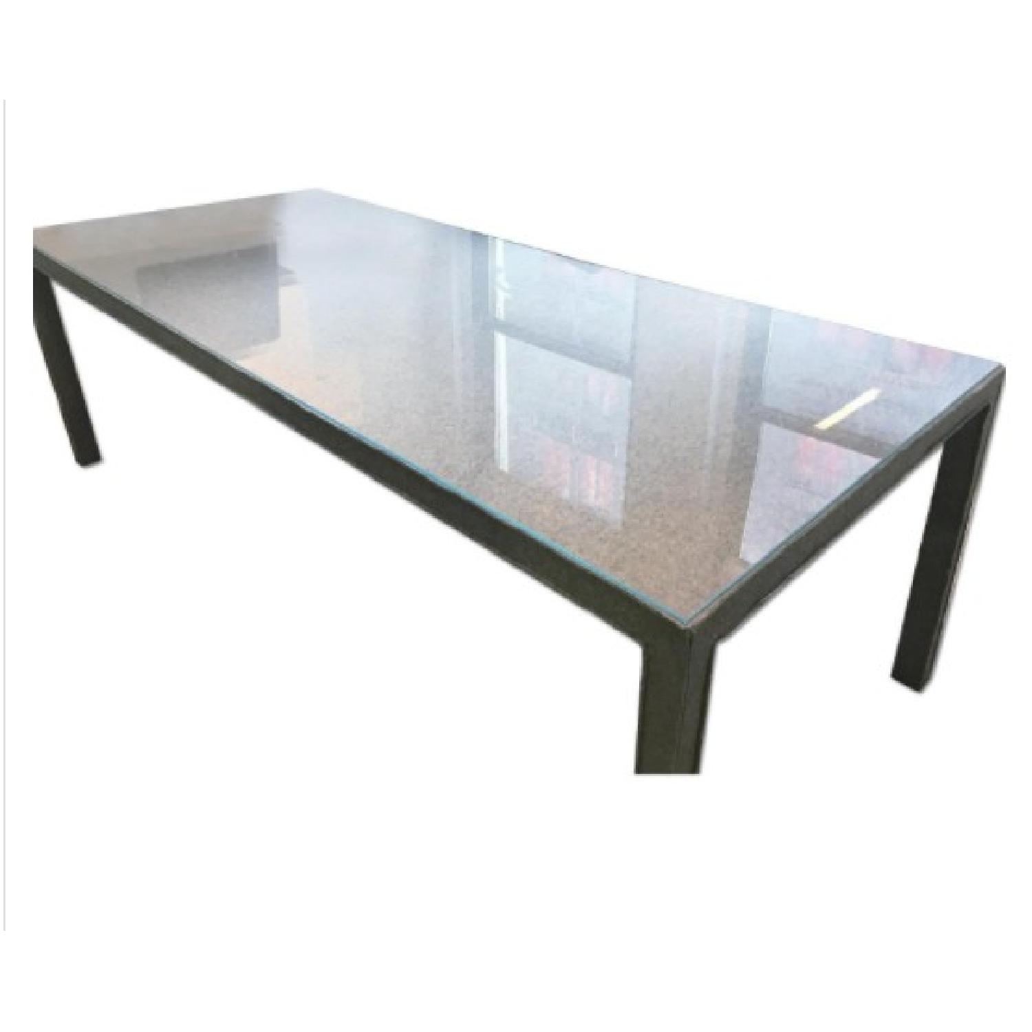 Seller's Notes:We're selling this beautiful multi-purpose table that could be used as an office table or as a dining table. The felt fabric gives it a unique look and is covered by a glass panel. w: 34" l: 84" h: 30"