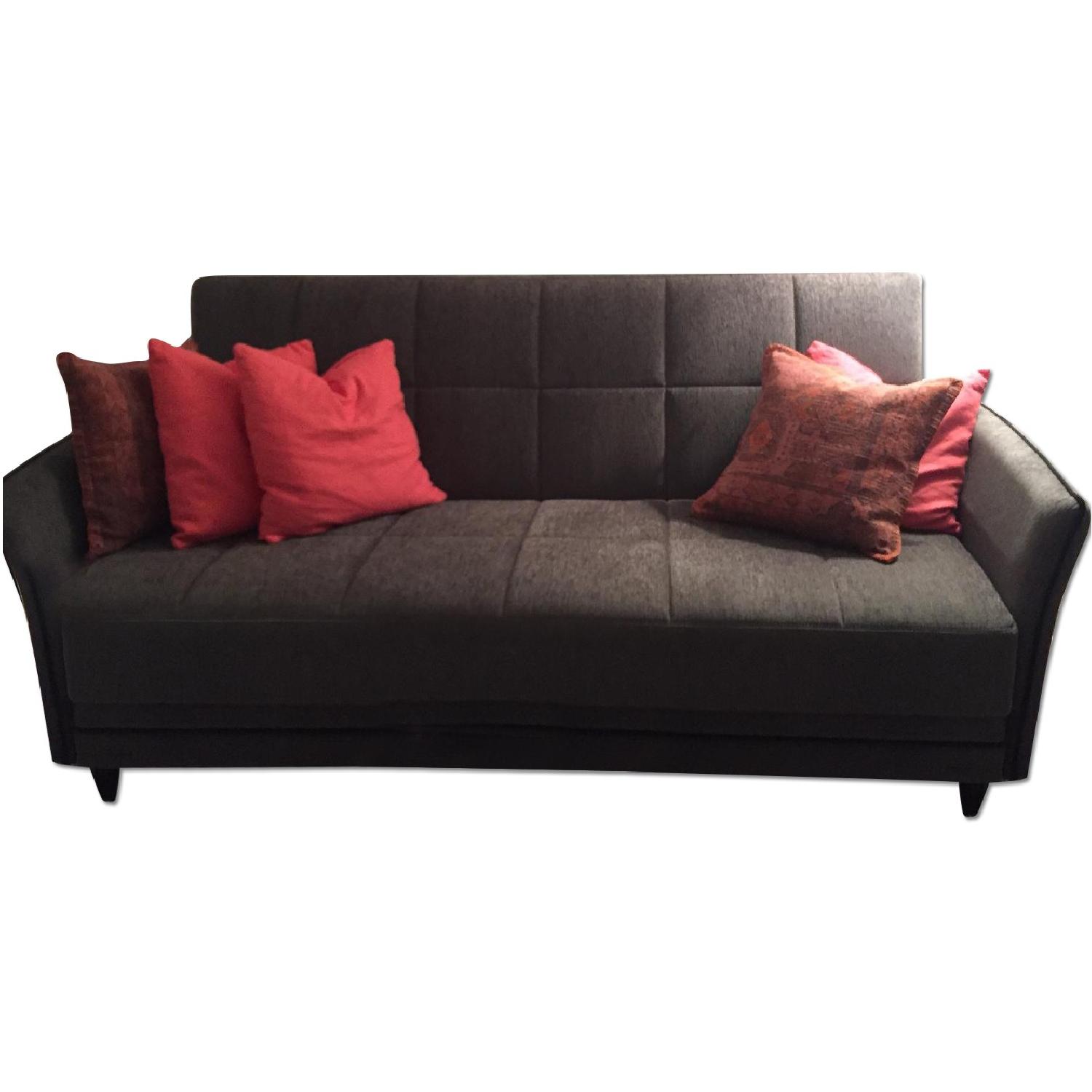 Seller's Notes:Purchased brand new futon a week ago and now must move for work. It is unwrapped from the box but never used. Great couch and futon. Storage underneath. Sells with the large black and grey pillows. Coral pillows were ones we bought but are keeping.