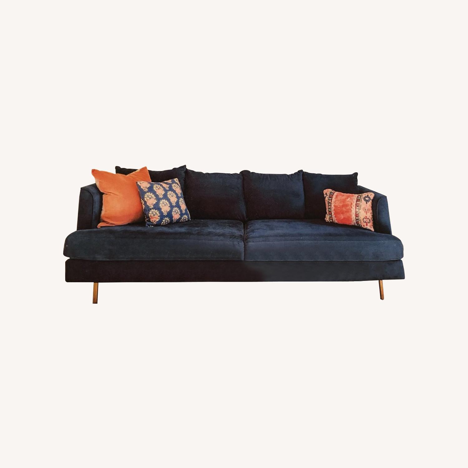 Seller's Notes:This midnight blue couch by Gus Modern is pure elegance and comfort. And it's also eco-friendly. French-seam detailing, and loose, luxurious cushions that give a look which is both timeless and contemporary. Brass finish legs complete the look. It is the most comfortable couch and is great for sleeping as well. It's easily cleaned by unzipping the cushion covers. The back cushions use a unique, eco-friendly synthetic-down, derived from recycled PET plastic. The frame is constructed with kiln-dried 100% FSC®-Certified hardwood. Margot uses a clean, ultra soft, long-strand fiber fill material that offers the comfort and feel of traditional waterfowl down. This material is created through a process that benefits the environment by diverting 567 plastic bottles away from landfills, waterways and oceans. I'm sad to have to part with this couch but will need a different size for my new space!