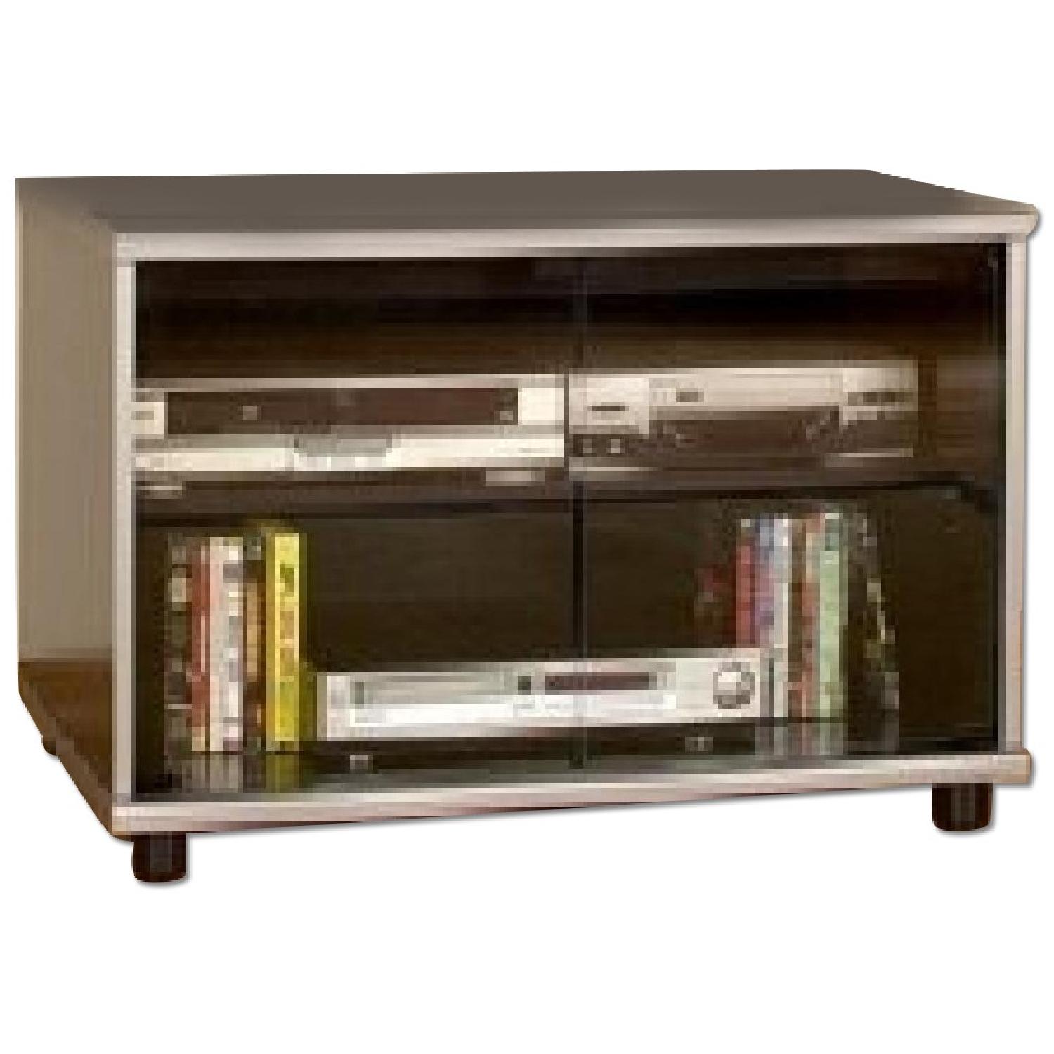 Seller's Notes:Stylish 32" TV Stand / Book or CD Storage. It is brand new in box, never been used. Silver with black combination with glass doors Made in Canada