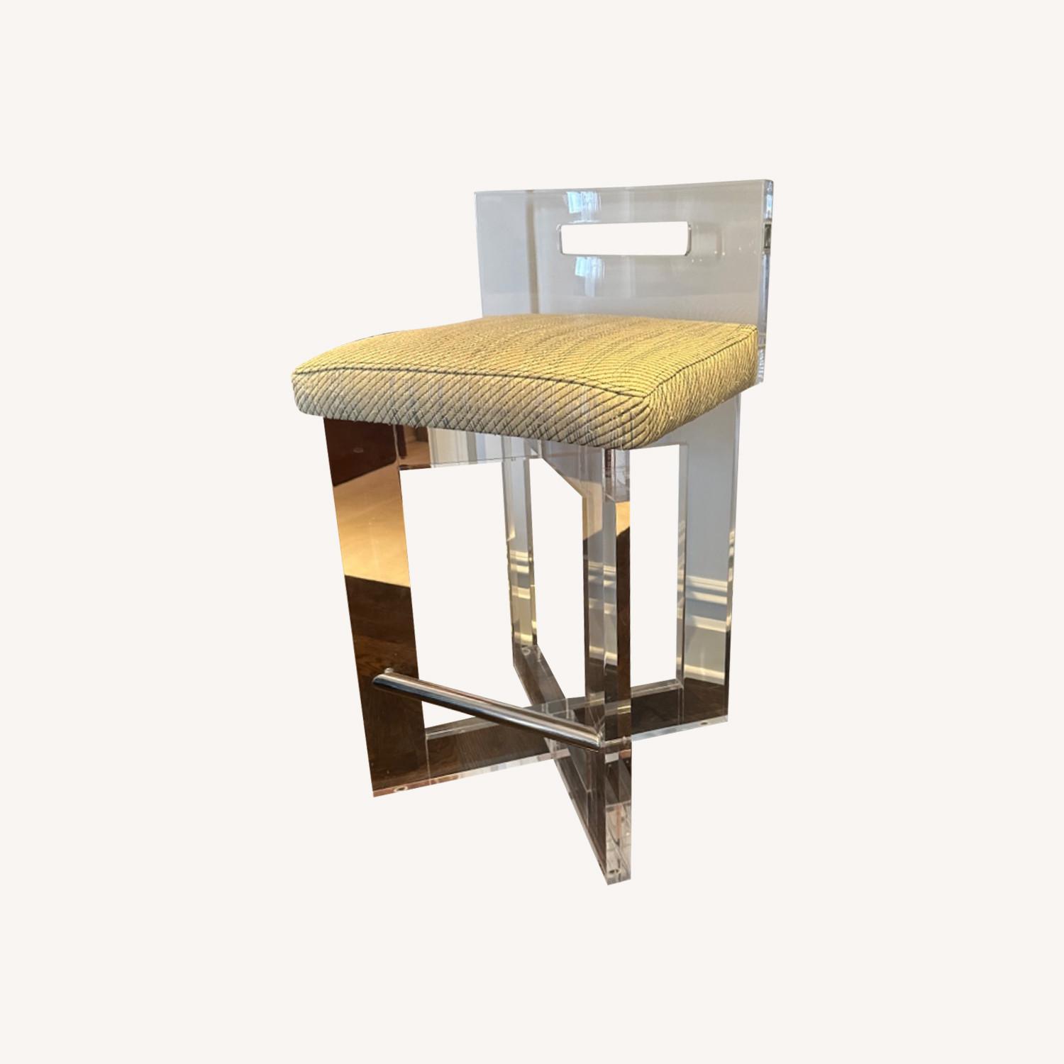 Seller's Notes:Art deco stools with acrylic base and fabric seat. These stools are solid and quite hefty.