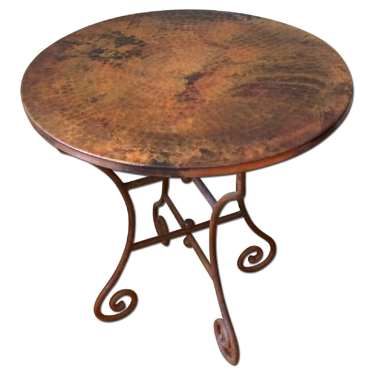 Seller's Notes:Two beautiful round copper top, scrolled iron bottom end tables, 2' diameter. The copper top is hammered with an acid wash finish; scrolled wrought iron base. Metals are reclaimed, date from early to mid-20th century. Purchased at United Wrecking, Stamford. Matching coffee table and planter also available here on AptDeco.