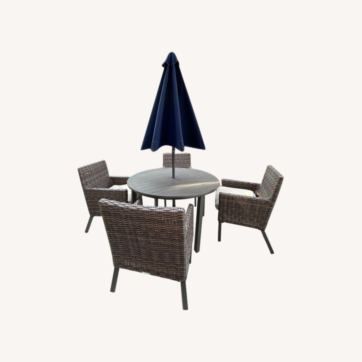 Seller's Notes:Dimension is for dining table. We’re moving out of our patio apartment after less than a year. This set is only gently used with only one summer season. It’s durable and heavy enough to sustain NYC summer hurricanes. We’re very sad to let it go but hope we can find a new home for the set. Please note, umbrella is not included in the set and the price. We’re open to negotiation, however, if you want the umbrella included.