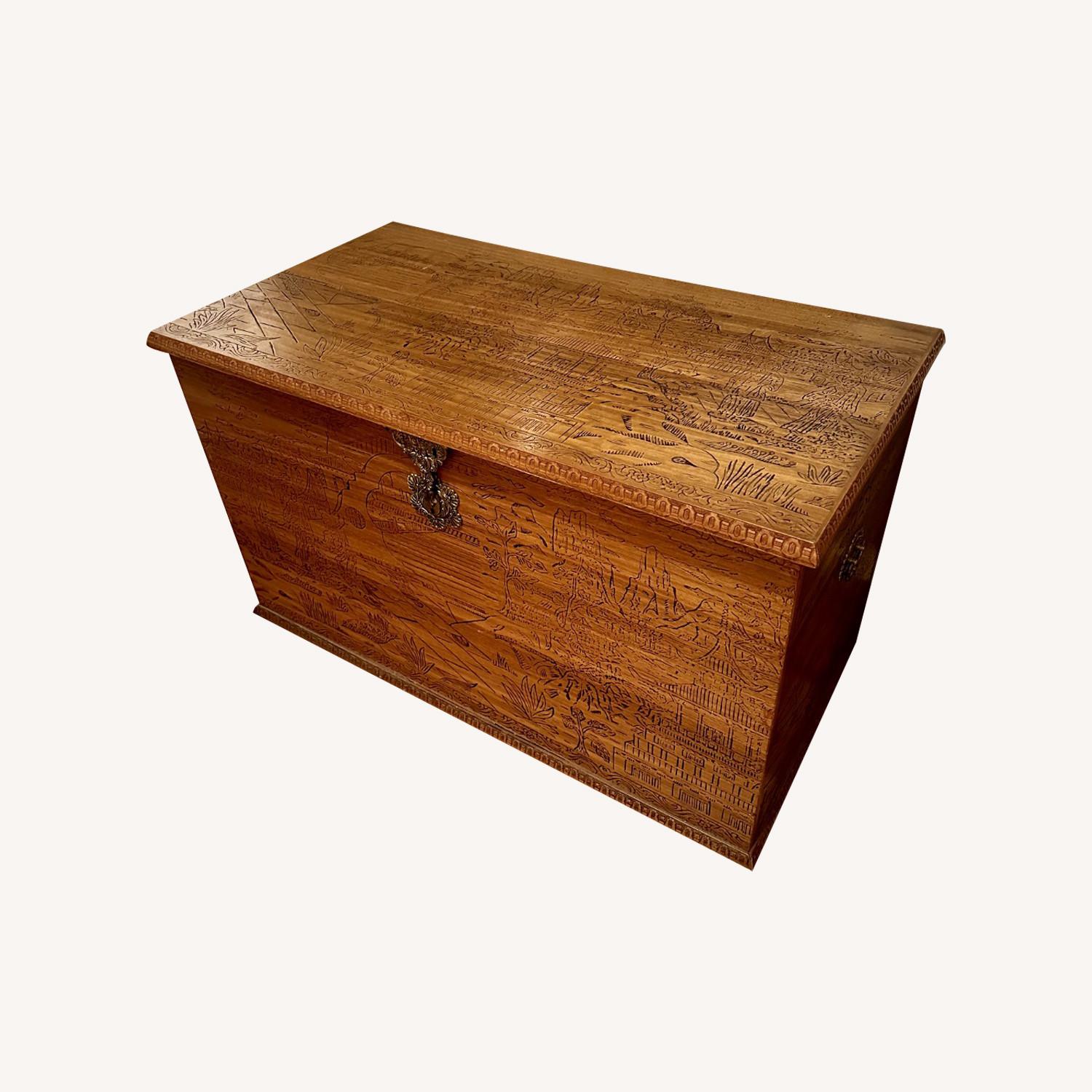 Seller's Notes:This gorgeous wooden chest was purchased from a local antique shop about 8 years ago. On all sides you will find exquisite hand-carved Chinese motifs and beautiful metal handles and hasp lock. This piece may be old, but it is versatile -- use for storage and decoration in your home. - Dimensions: 42" x 22.5" x 26.5" - Excellent, well-maintained condition - If pickup: We live in a first floor brownstone, only need to worry about carrying down the front stoop. Not a whole flight of stairs.