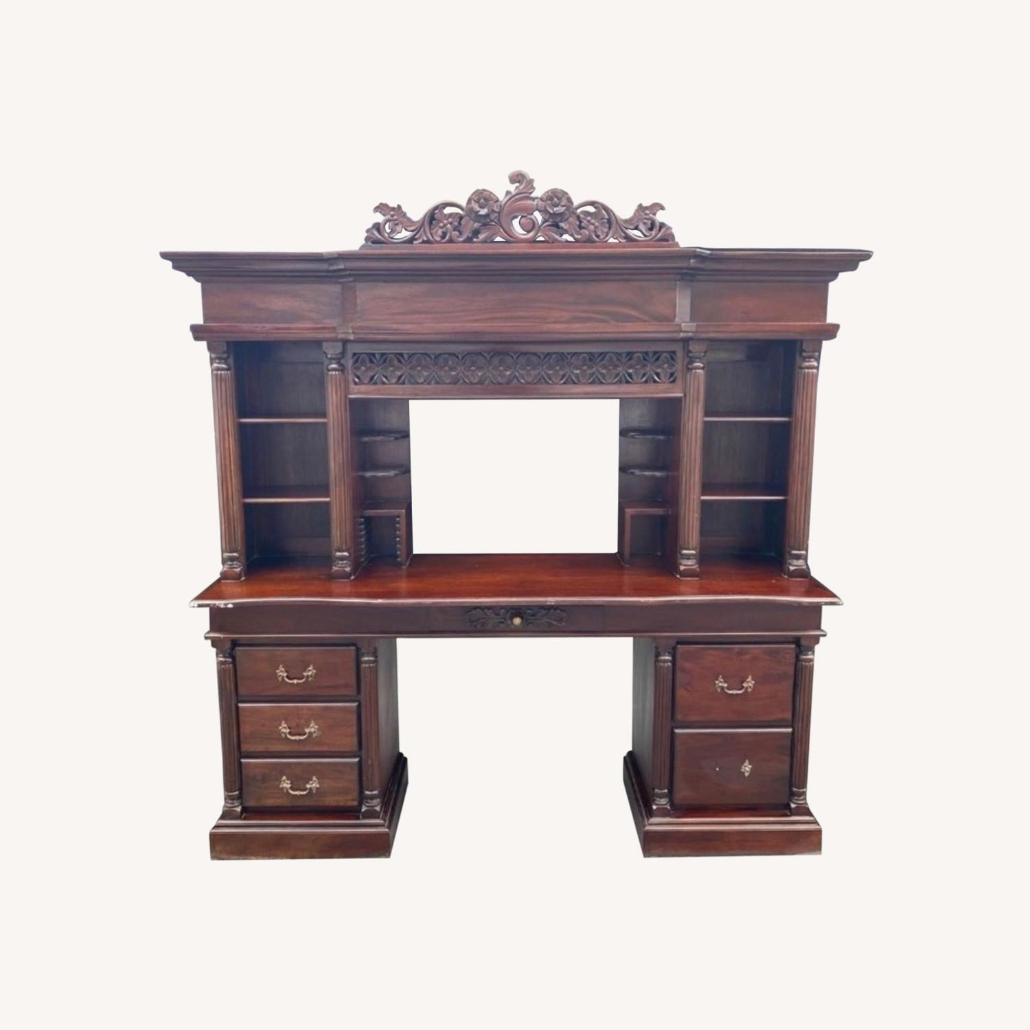 Seller's Notes:This hutch desk was 100% Indonesian wood handcrafted. Absolutely gorgeous with some minor damages (paint on one side of table and broken hardware). Wish I could keep it but my new place is much smaller. This desk has 5 drawers (4 deep drawers and 1 under the middle of the work space) and numerous shelves and cubbies. Great for a maximalist who likes to display their collection, anyone who utilizes many materials/tools and likes to keep them on hand, or someone who enjoys the intricacy of this piece.