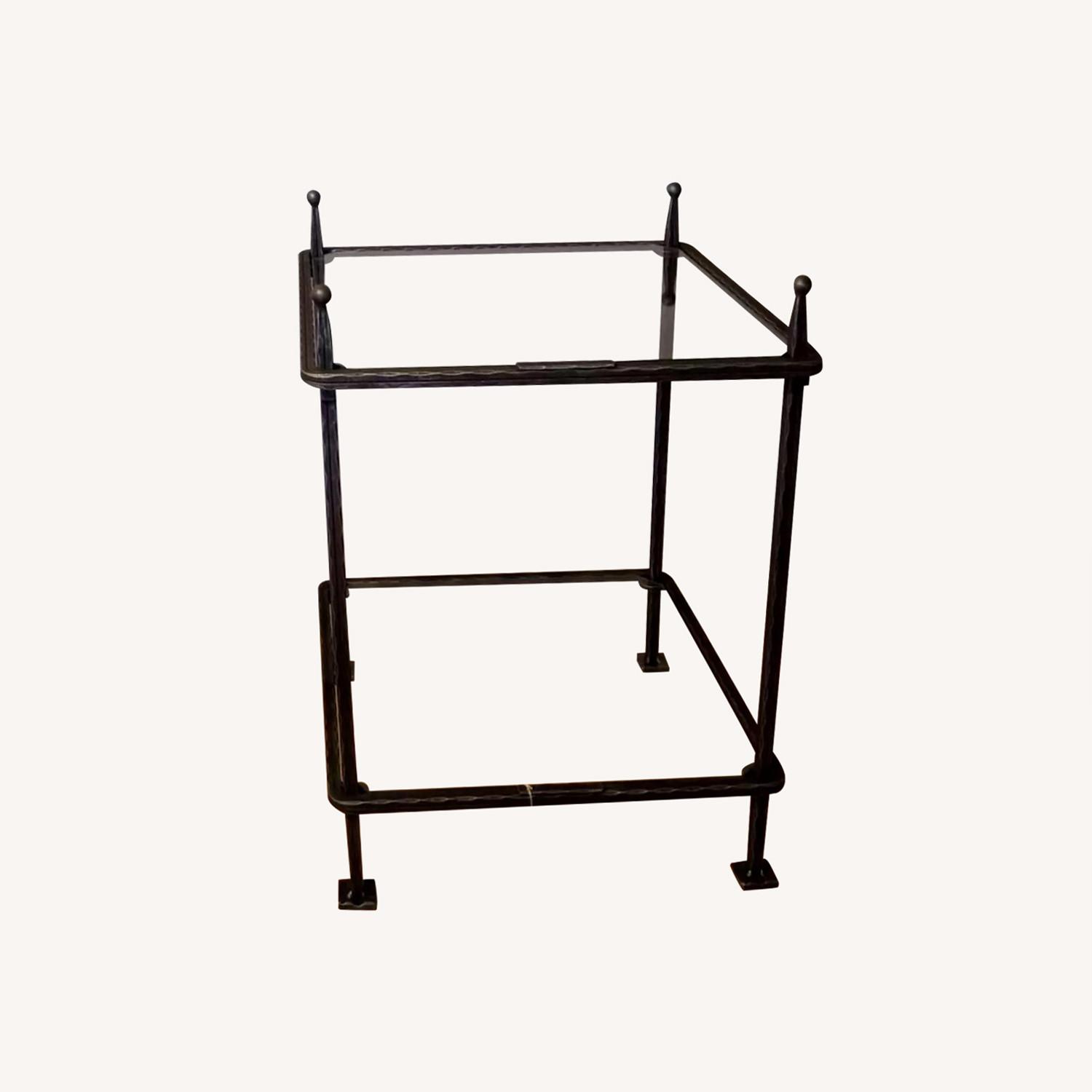 Seller's Notes:2 Claudio Rayes Hand Forged Wrought Iron Pewter Night Stands, End Tables NOS. The material is wrought iron, the color is pewter. The glass is included. They were designed in Italy and made in Buenos Aires Argentina. The tables are 28" tall and 20" square.