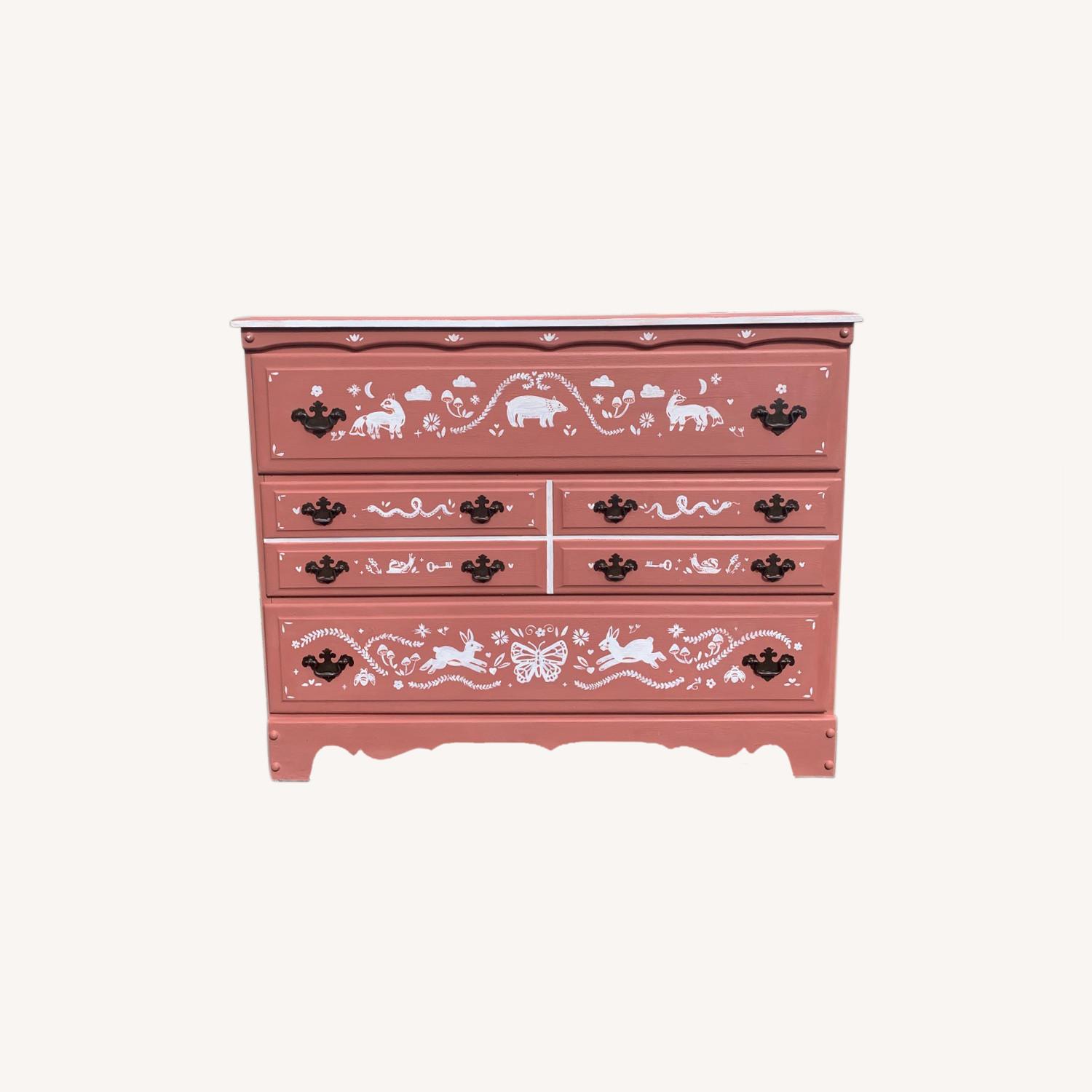 Seller's Notes:Hand-painted “Scandinavian pink” dresser that could double as a changing table. Would fit in well with a woodland creature themed girl’s room; hand-painted with rabbits, butterflies, and flowers. Minor distressing but excellent hardwood construction with dovetail joints. Sealed in a creamy matte finish. Would consider the inside of the drawers like new.
